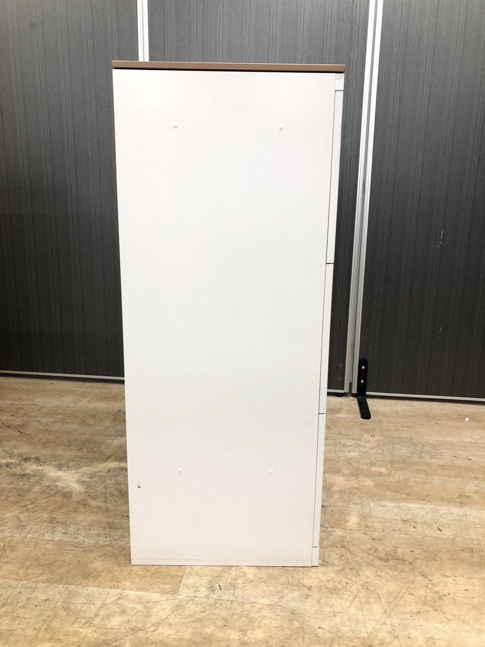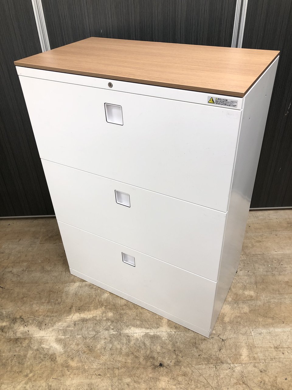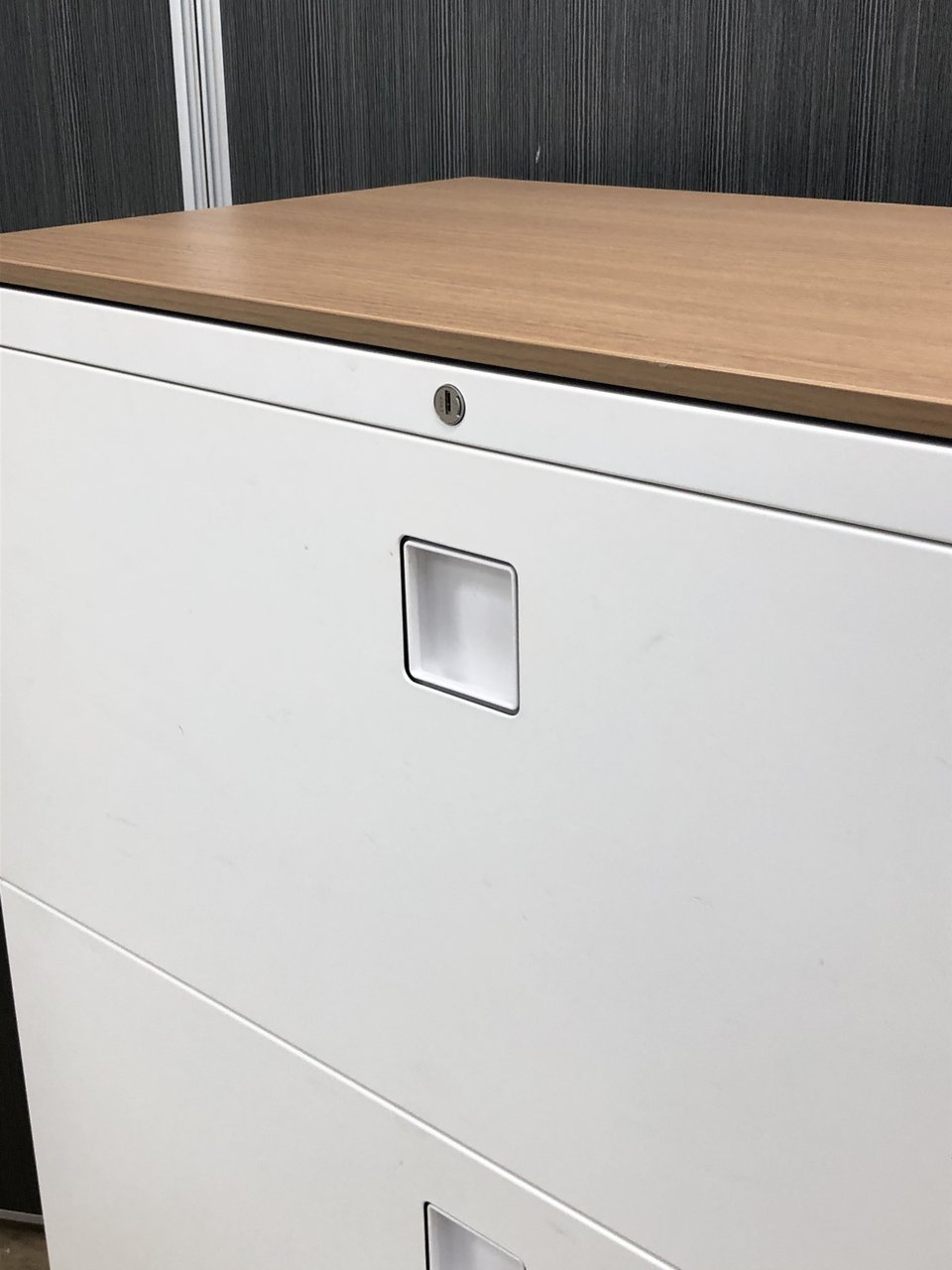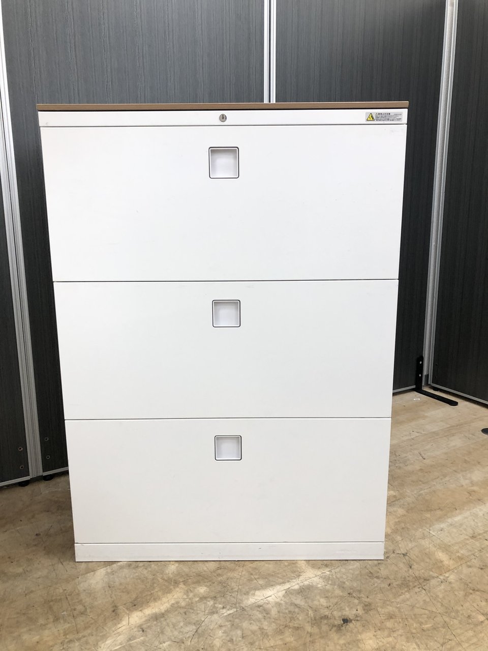 オカムラ レクトライン 3段ラテラル書庫 ホワイト天板 シリンダー錠 鍵付き ※取っ手部分に若干日焼けあり