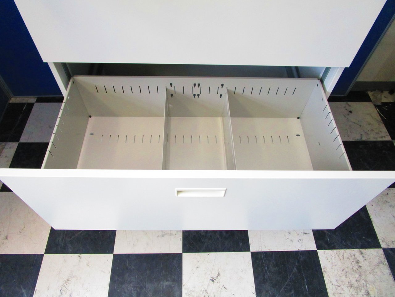 下置き用の3段ラテラルは引き出し型の書庫ですので、書類の分類管理にたいへん便利です。