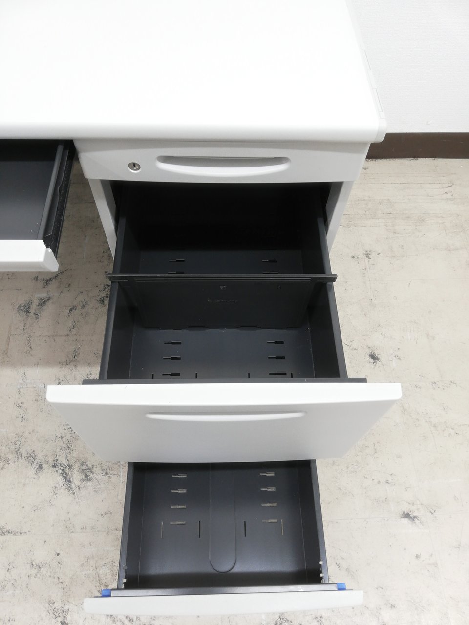 - 袖机のワゴンは、最下段がロング引出しになっており、従来より収納力120%アップ。
