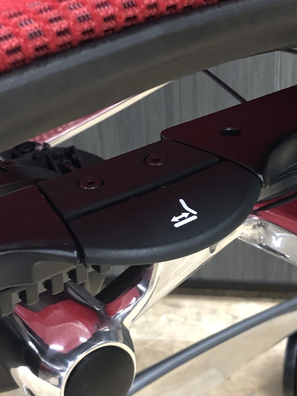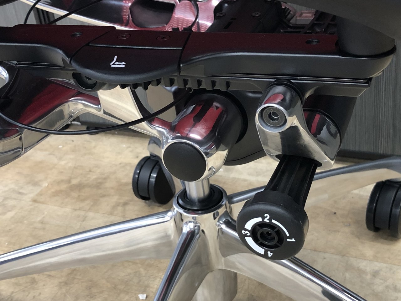 - ロッキングの強弱を調整するダイヤルがございます。体型に合わせてリクライニングの固さを座ったままで調整できます。