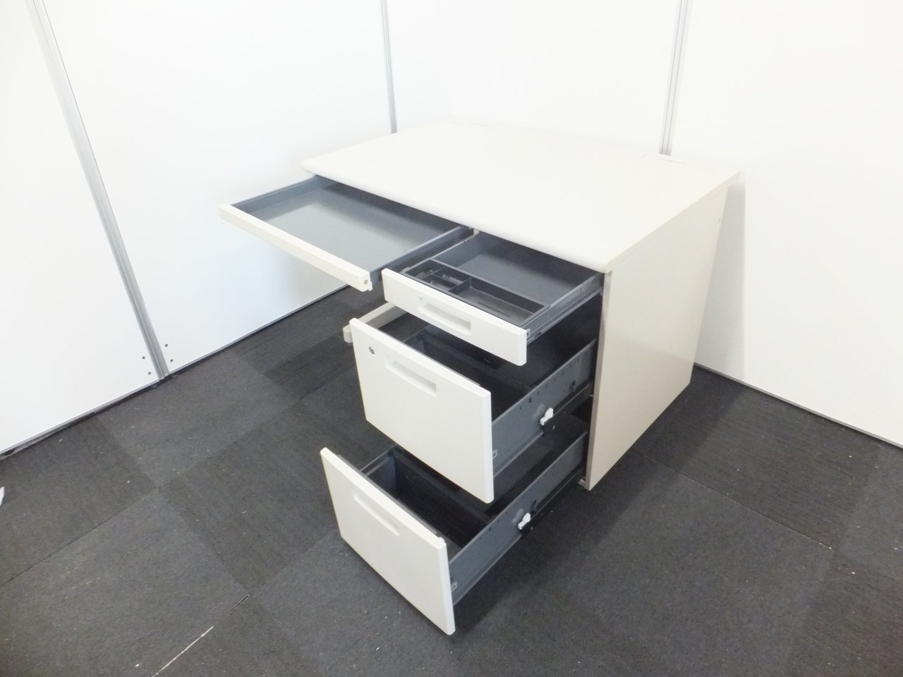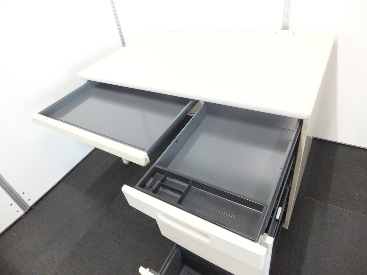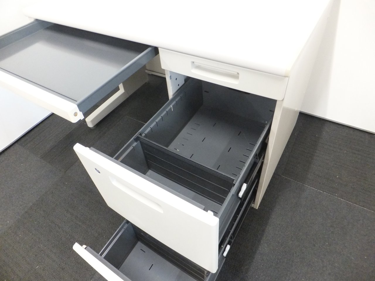 広々とした倉庫スペースに豊富な在庫がございます。オフィス家具が中古で一式そろいます!