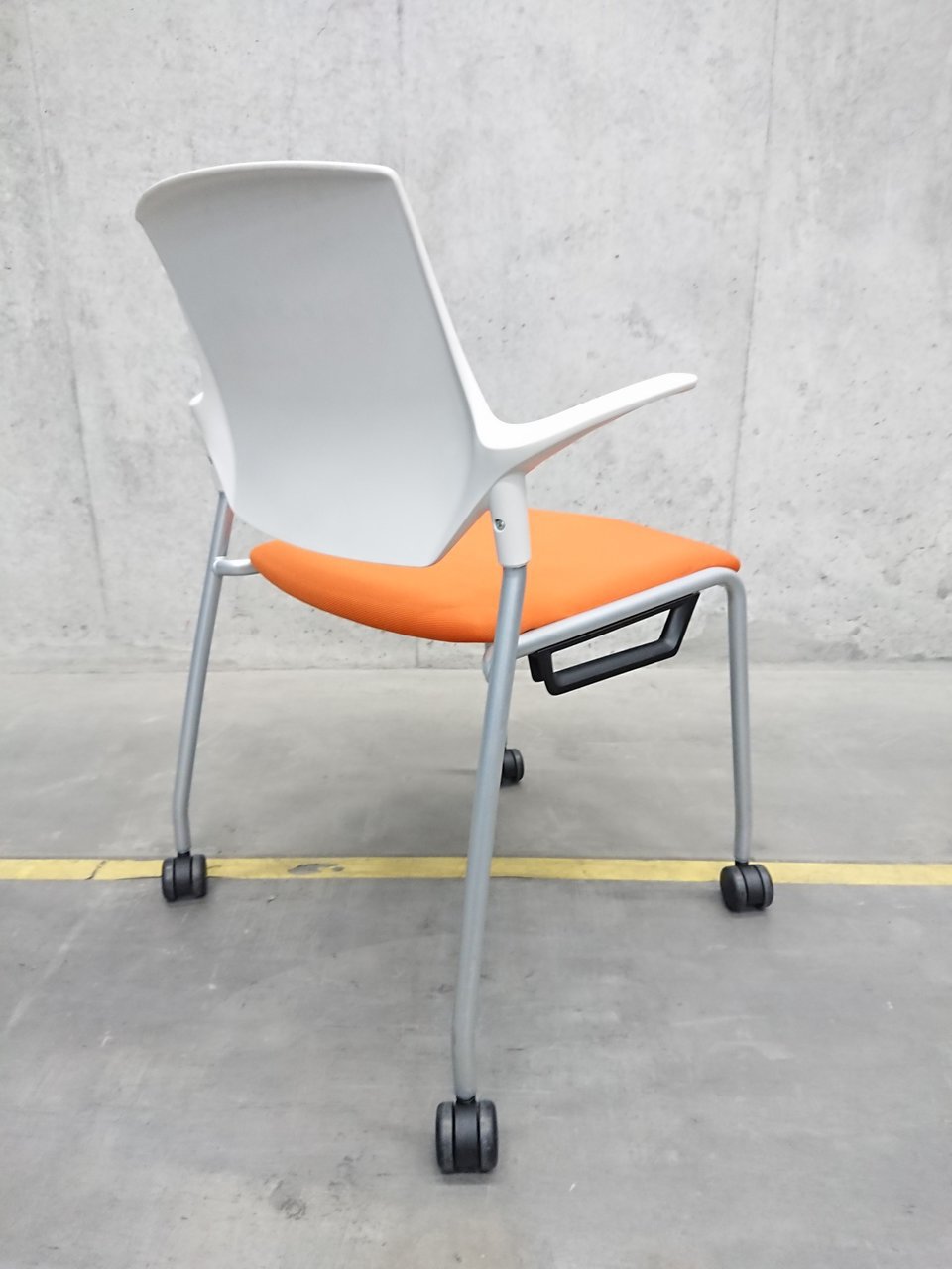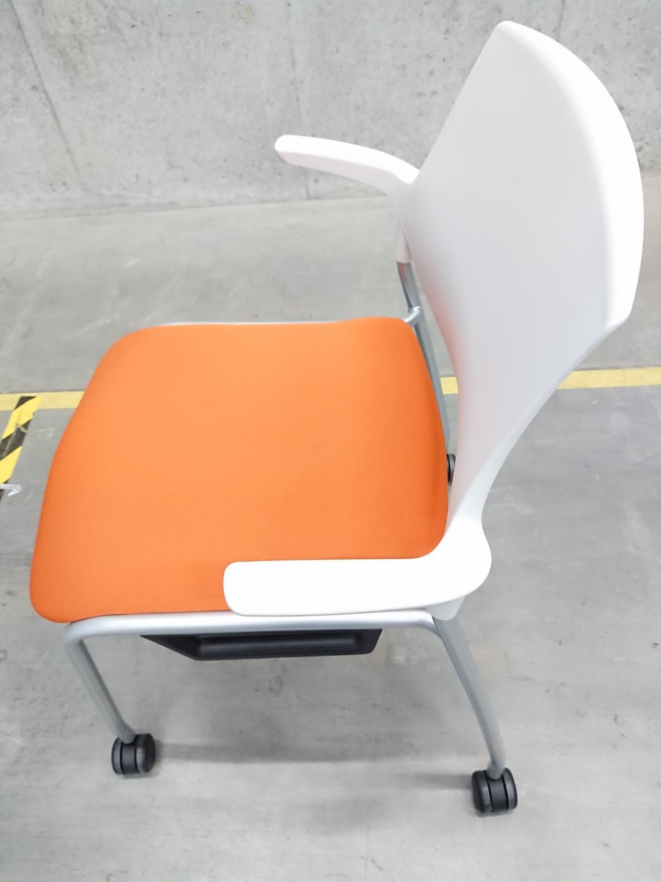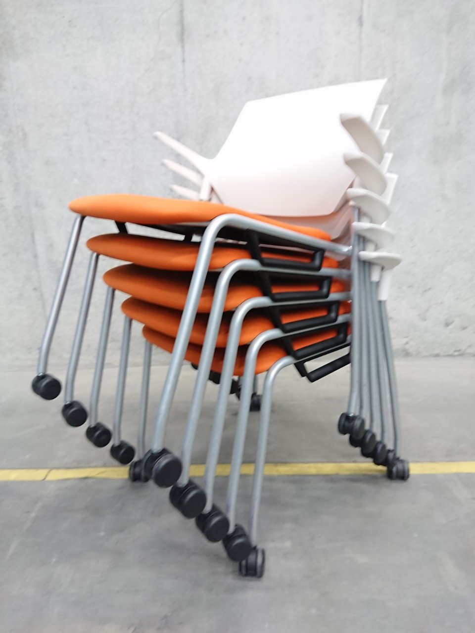 縦に4脚まで重ねられ、しかもキャスター付で移動も簡単の為、スペースの有効活用にも貢献します。