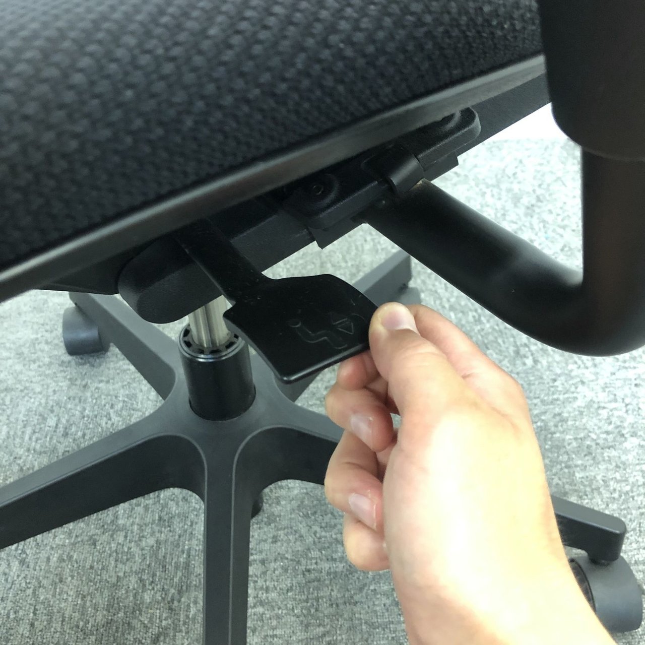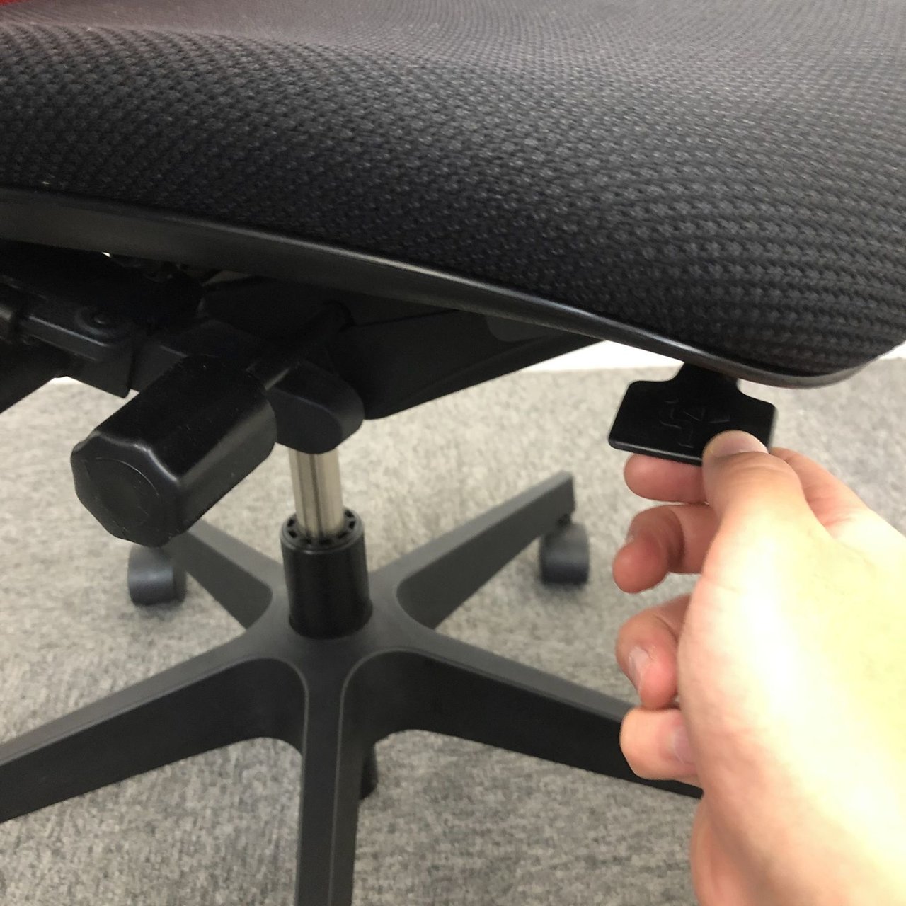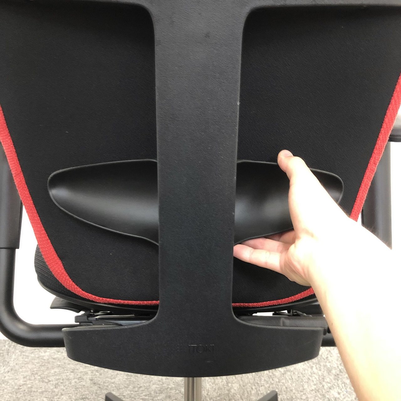 例えば、座面は、イトーキ独自の"ベンディングシート"という機構により、クッション、インターシェル、空洞という三層構造になっています。 この真ん中に挟まっているインナーシェルが、着座時の姿勢に合わせて体重を分散してくれるので、どんな姿勢でも体になじみ、疲労を軽減してくれます。 さらに、座面は前後に4センチほど奥行きを調整でき、前傾姿勢で座りたい、深く腰掛けたい、膝裏を圧迫されたくないなど、個人の好みに合った快適さにカスタマイズが可能となっています。