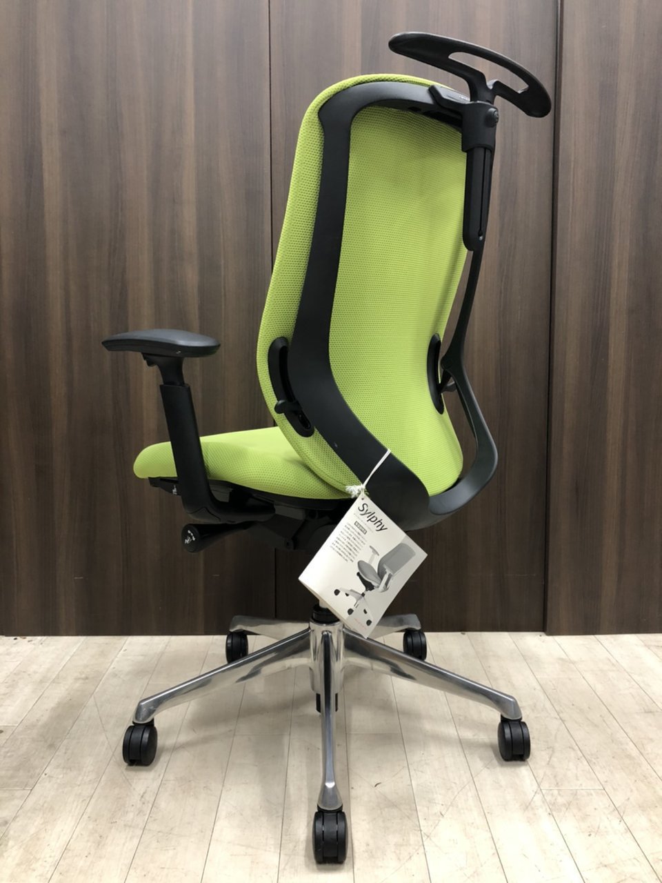 【在庫入替セール品】【人気のシルフィチェアヘッドレスト付きが1脚限定入荷!】オカムラ シルフィ ライムグリーン エクストラハイバック ホワイトフレーム デザインアーム(固定肘) 前傾チルト機能付き
