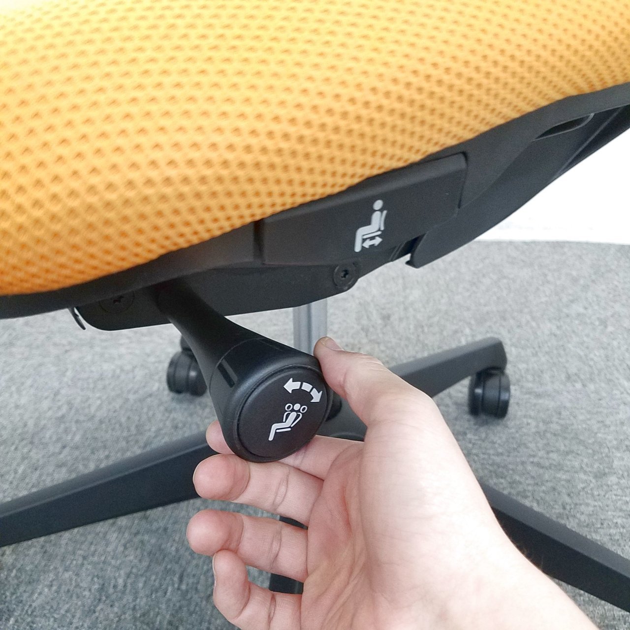 - 座面左下のダイヤルでリクライニングの固定と解除が行えます。 前傾ポジションをとることも可能です。