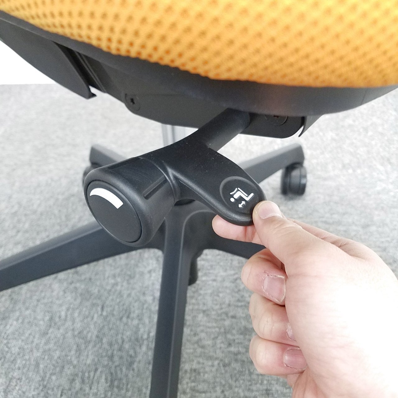 - 座面右下のダイヤル操作で、リクライニングの強弱調整が行えます。これまでのダイヤル式よりも、少ない回転数で、最弱?最強の調整が可能です。