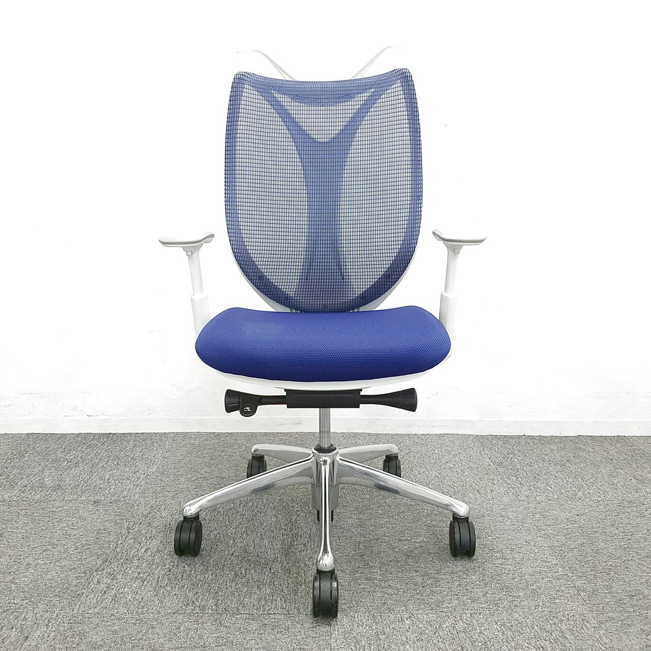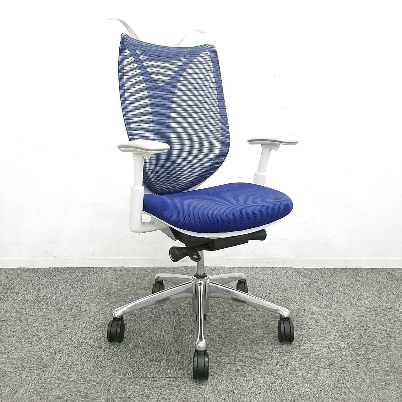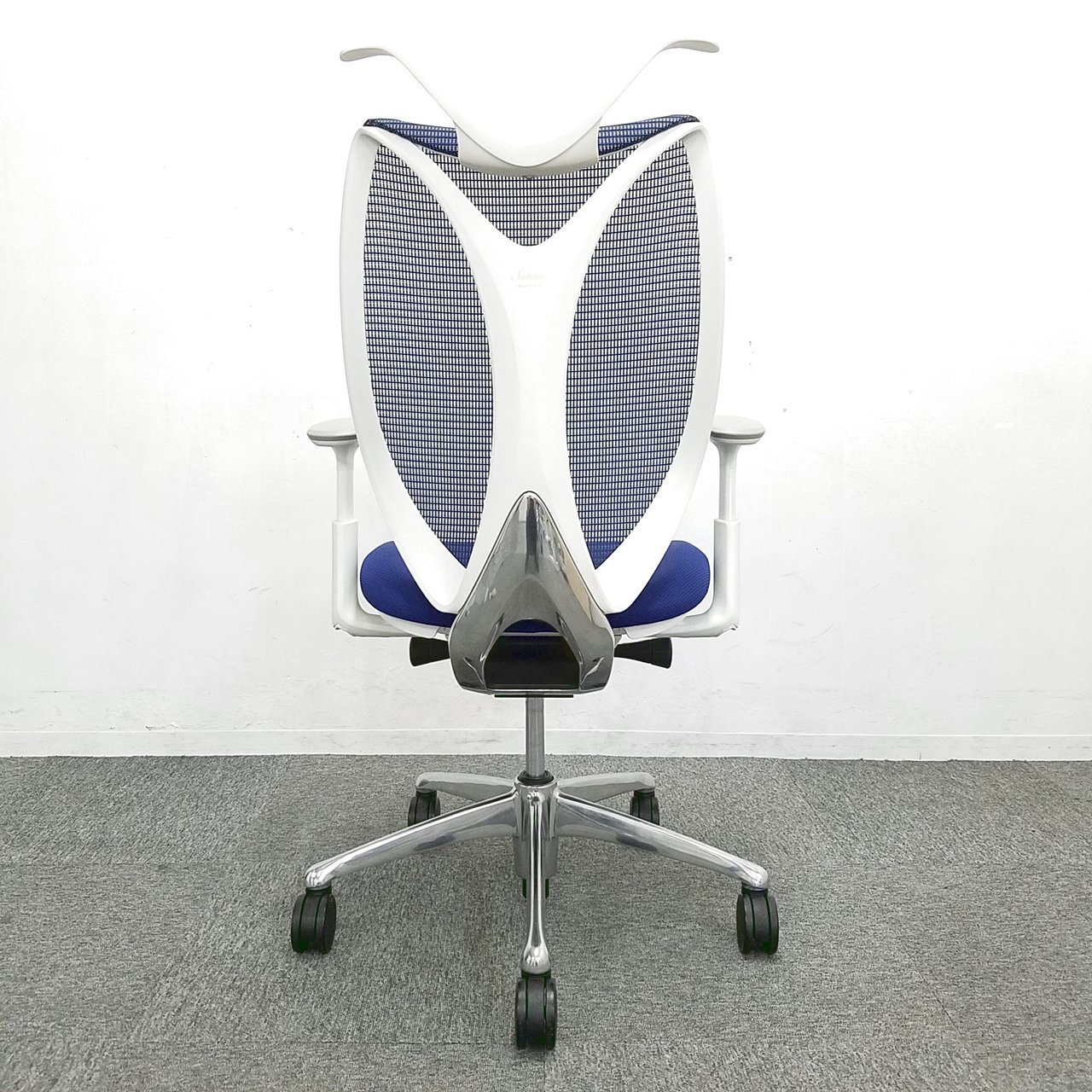 【前傾チルト付!流れるような美しいフォルムの最高級メッシュチェア!】■オカムラ(okamura)製 Sabrina(サブリナ) ハイバック 肘付き ■可動肘 ■背面メッシュ:アクアブルー 座面:ブルー ホワイトフレーム