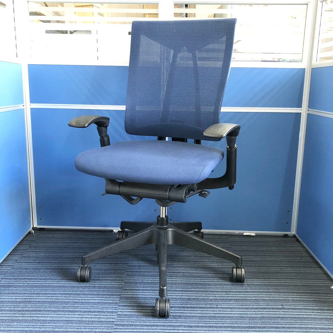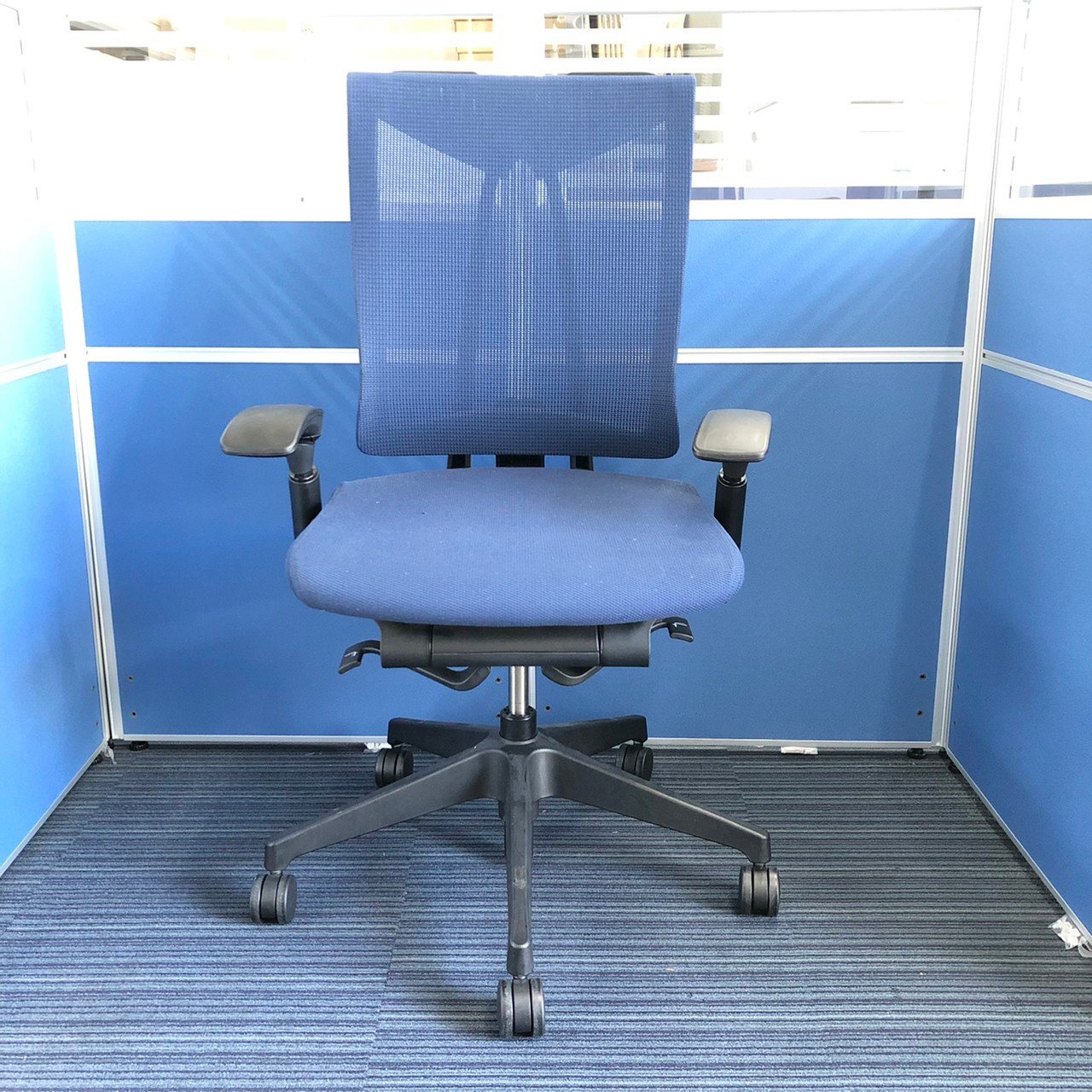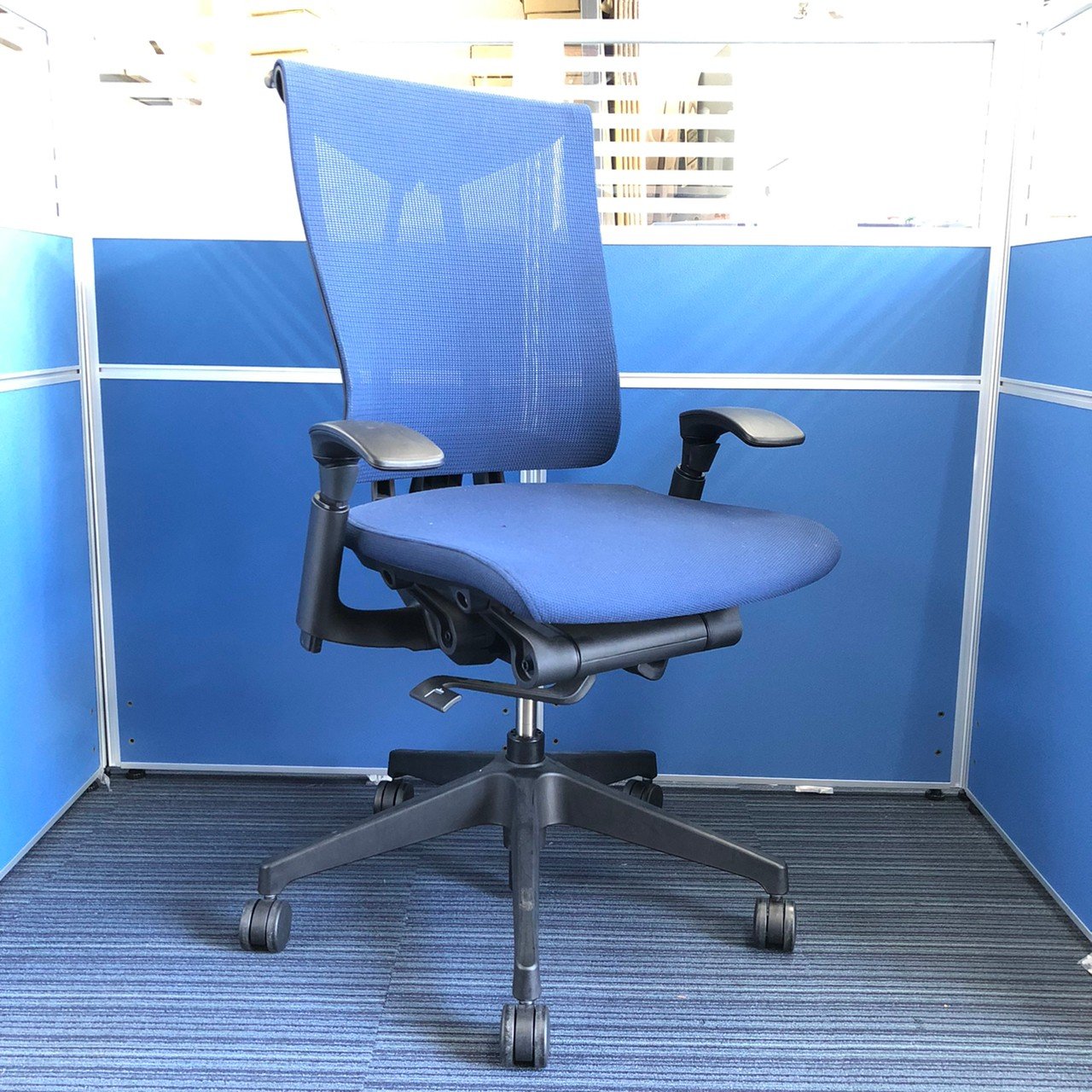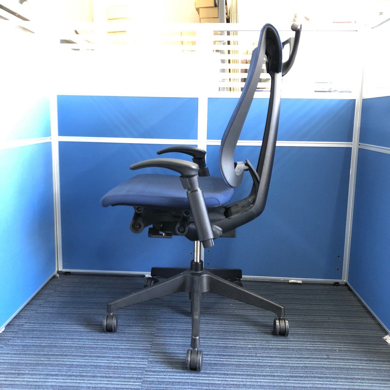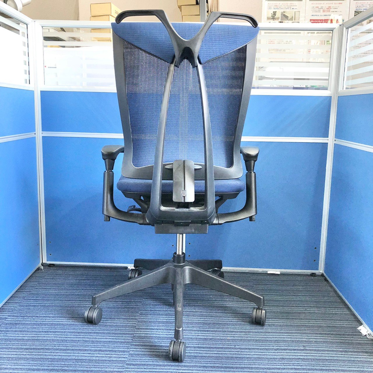 【K11】【T9】【商品入替のため、残り4脚限り】イトーキ製 セレーオシリーズ ネイビーブルー メッシュ背面 ブラックフレーム アジャスタブル※可動肘 ハンガー付 座るとわかる快適さ・骨盤にしっかりフィットする! チェア自らが動き座る人の体を支える「おもてなし」の心を体現した高級チェア! 肘付きハイバックチェア!!