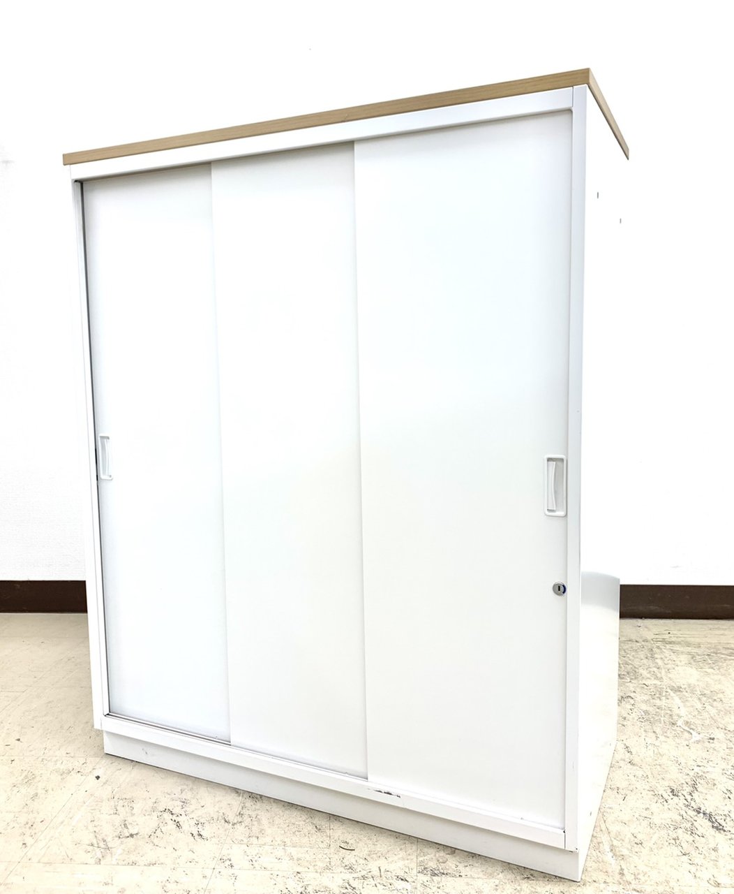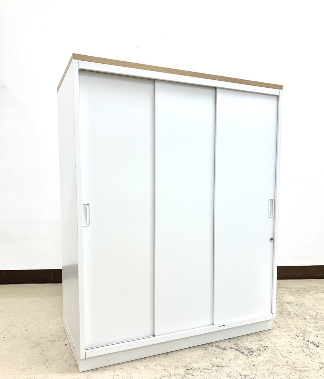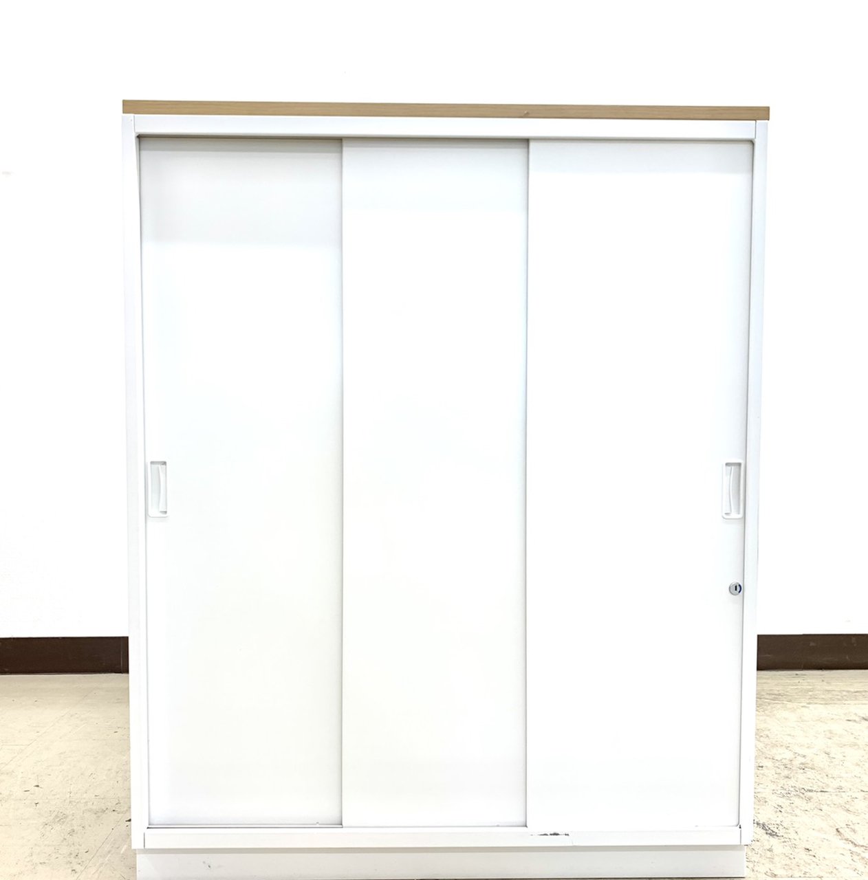 【スライド式なので開閉スペースに困りません!人気の3枚引き戸書庫!】■イトーキ (ITOKI)製 シンラインシリーズ 引き違い書庫 ローキャビネット 3枚引き戸 H1120㎜ ■天板付 ■ホワイト ■シリンダー錠