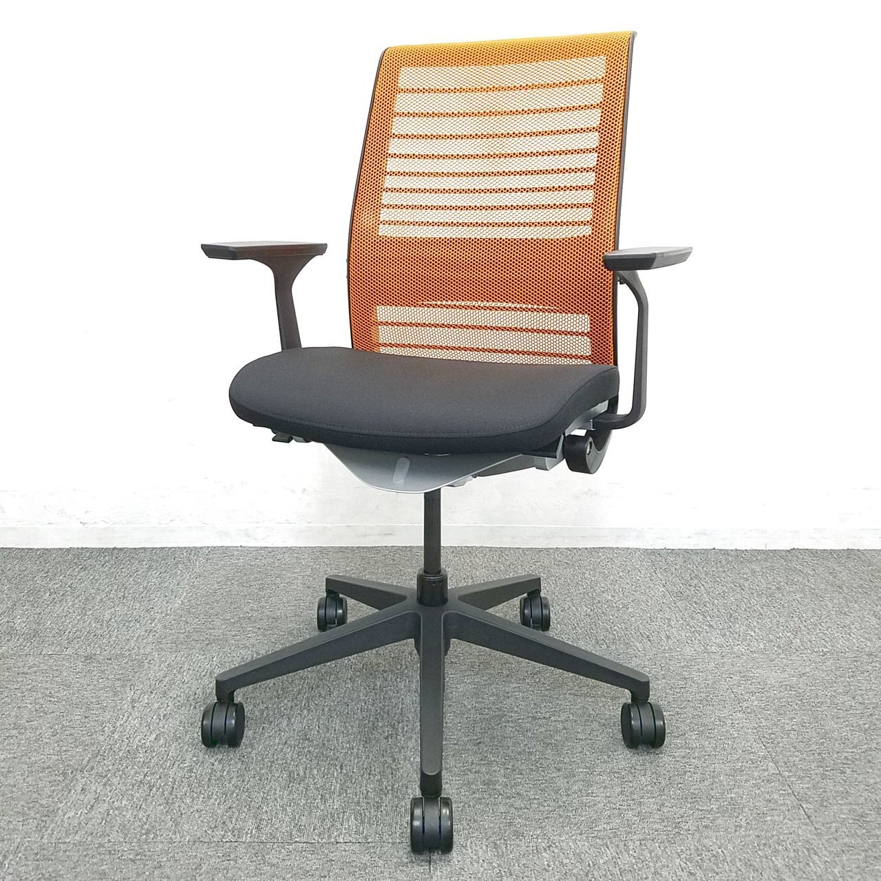 【定価約16万円】【ワイヤーが体にフィットするアメリカ発の大人気商品!長時間の着座ストレスを軽減!】 ■スチールケース(Steelcase)製 シンク(think)チェア 肘付き ハイバック ■メッシュバック ■固定肘/ランバー付 ■背面:オレンジ/座面:ブラック〈岐阜・愛知・三重・静岡・福井〉