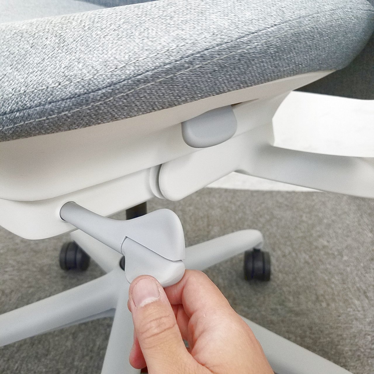 - 座ったまま、レバー操作一つで、簡単に座面を前傾できます。前傾姿勢を取ることが多いデスクワーカーに最適です。
