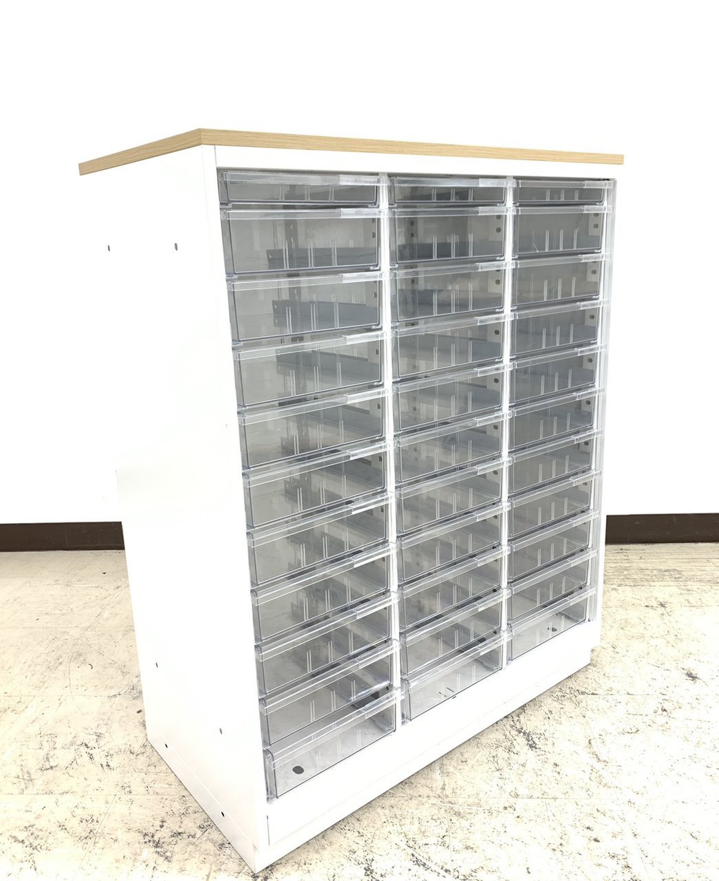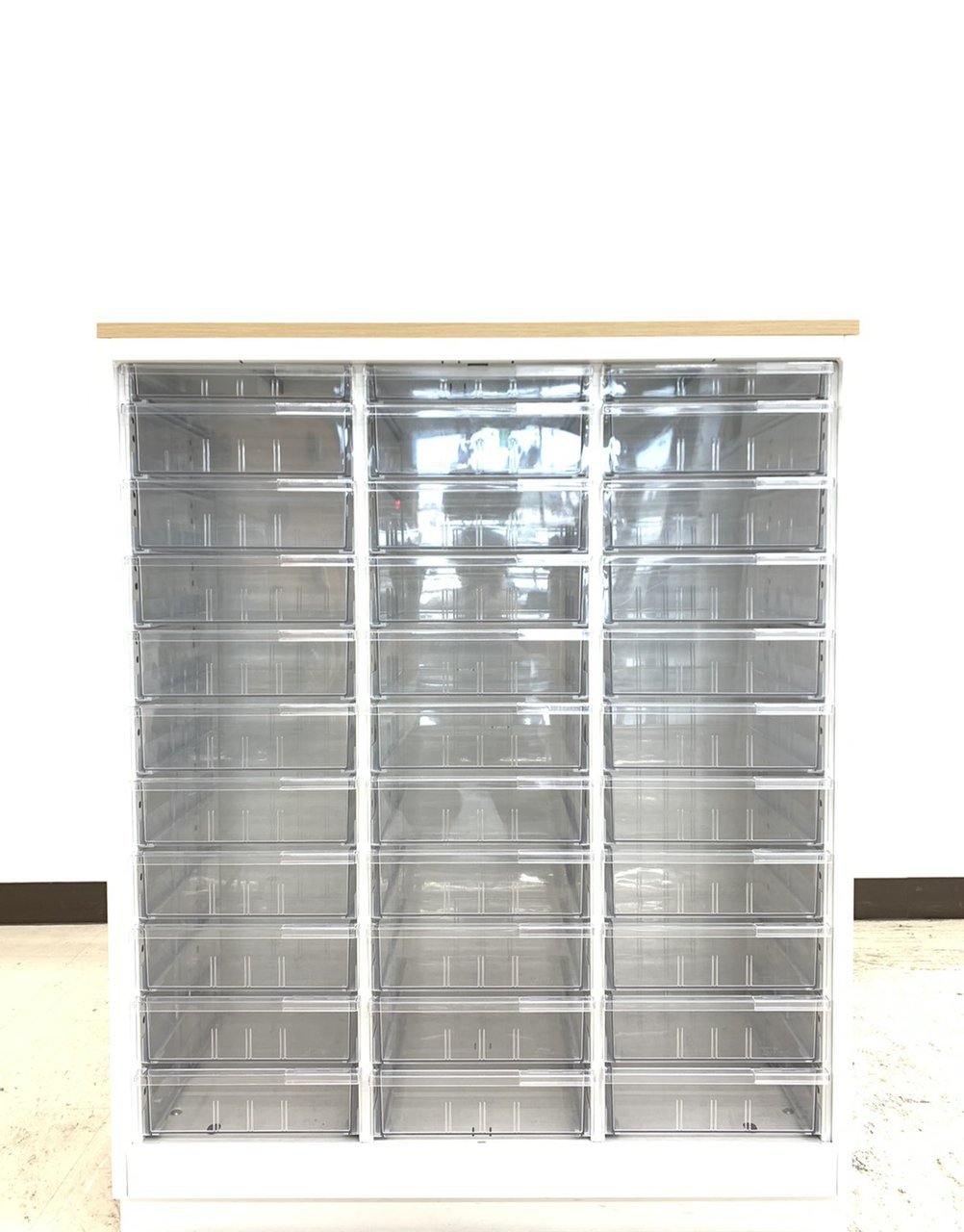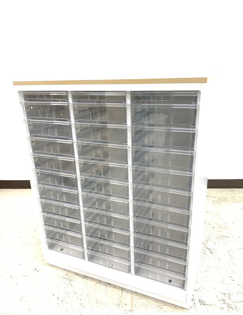 【書類・備品整理の必需品!】【珍しいクリトレが入荷!3列×浅型11段+深型5段】■イトーキ(ITOKI)製 シンラインシリーズ クリスタルトレー ローキャビネット ■3列×浅型11段+深型5段 ■天板・ベース付 ■色:ホワイト