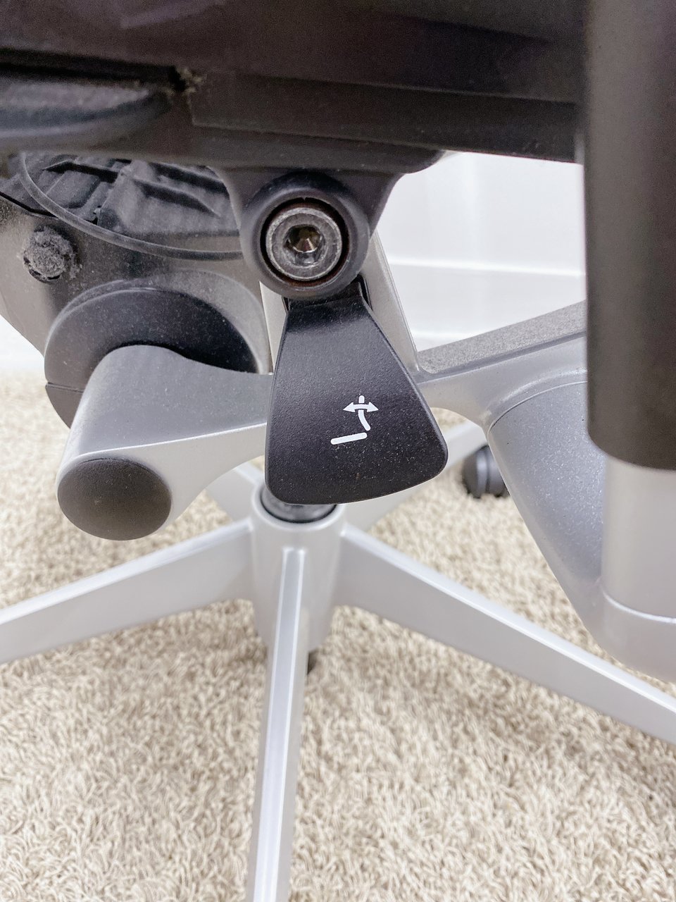 座面のすぐ右下にあるレバーの操作にて、座面位置の上下調整(100mm)が可能です。