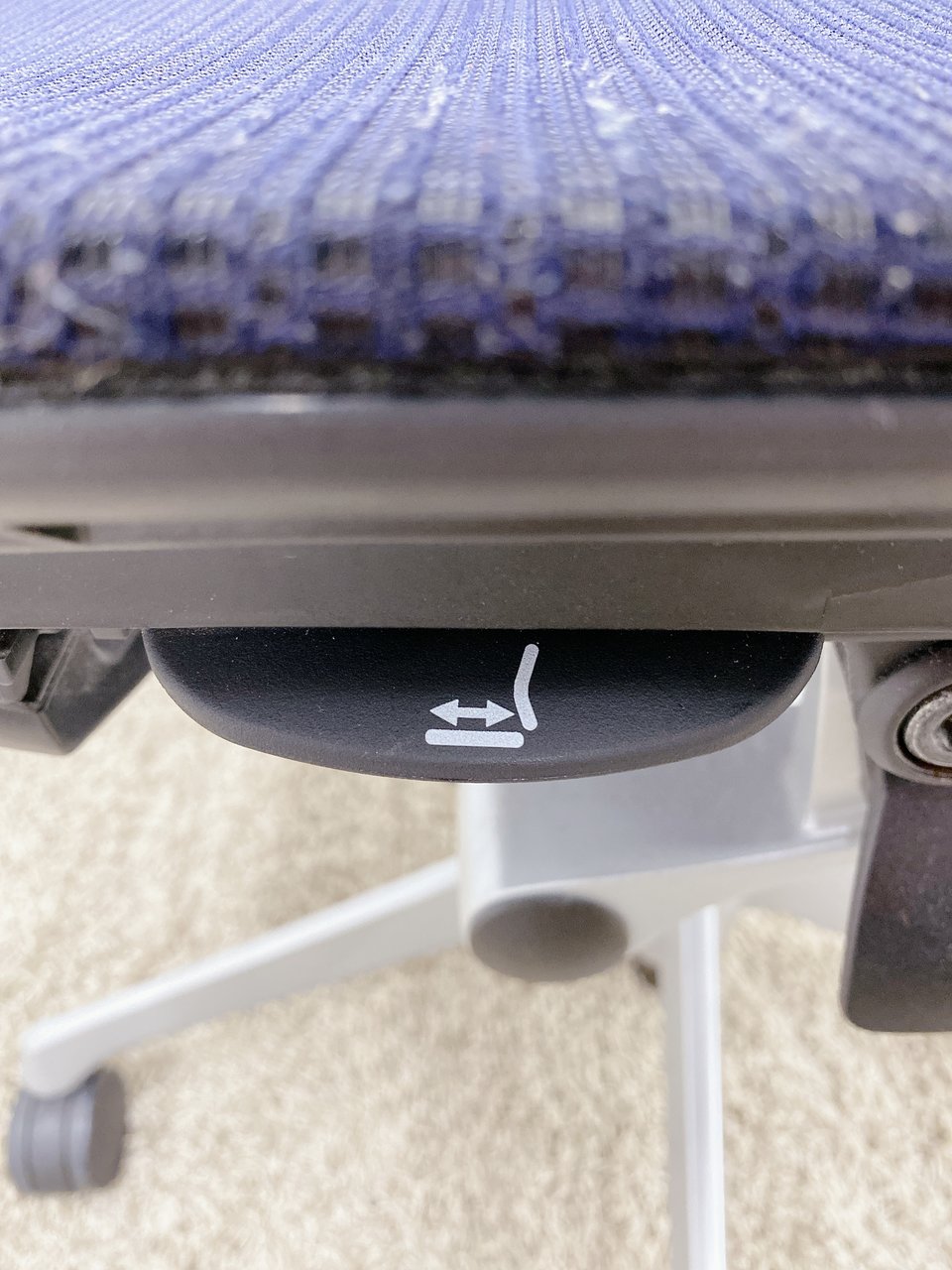 両手を自然に下ろした位置にあるレバーにて、座面の前後スライド調整(前後50mm)が可能です。
