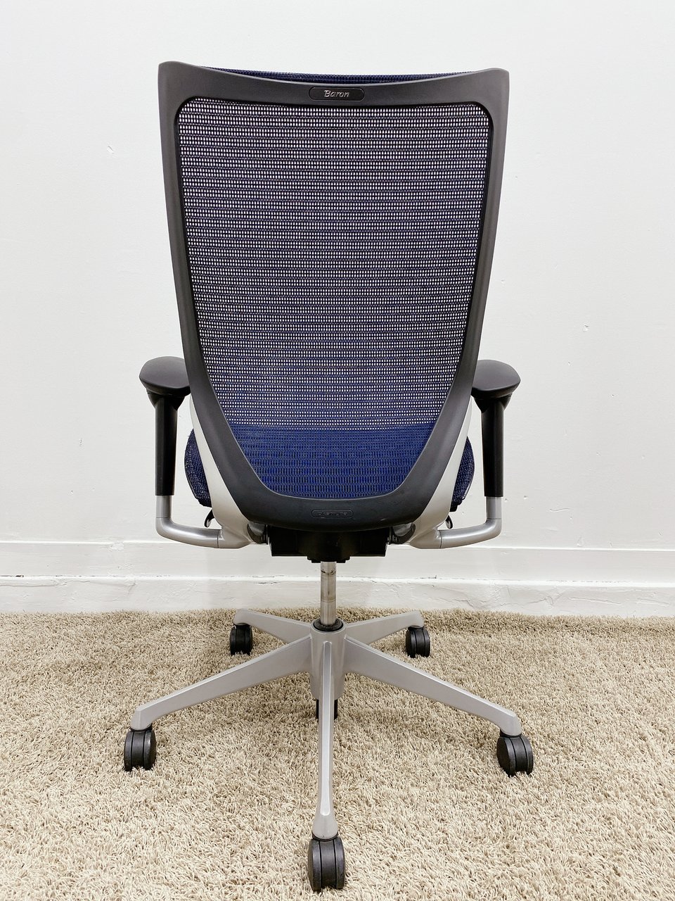 【オフィスの執務室、会議室におすすめ!】■オカムラ(okamura)製 バロン(Baron)チェア 肘付き ハイバック 背面メッシュ ■可動肘 ■ダークブルー × ホワイトシェル【硬めの座面が大人気!国産メッシュチェアの代表格!】