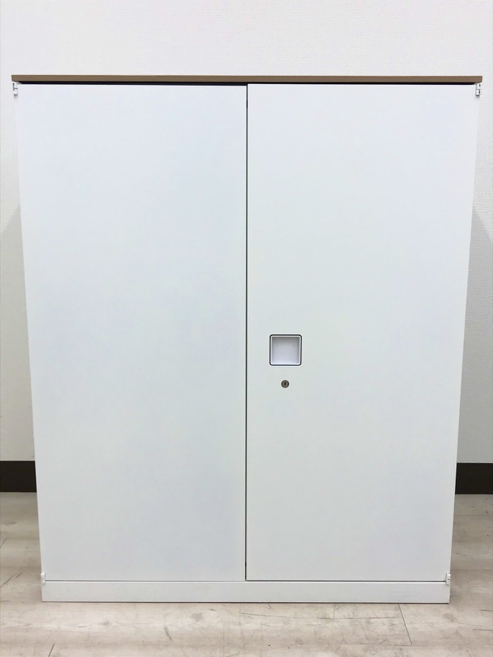 【オフィスの書類をスッキリ整理!取っ手がどの方向からでも開くマルチハンドル!】■オカムラ(okamura)製 レクトラインシリーズ 両開き書庫 ローキャビネット ■本体色:ホワイト ■シリンダー錠 ■ナチュラル天板付き