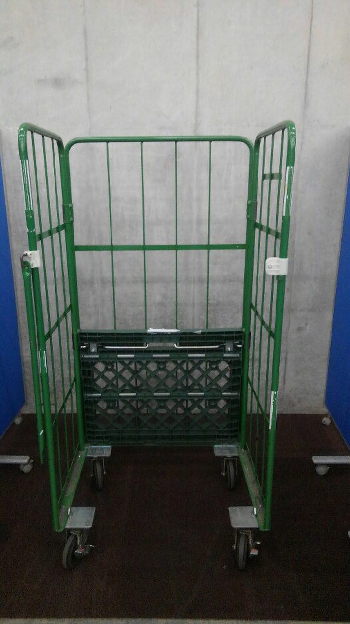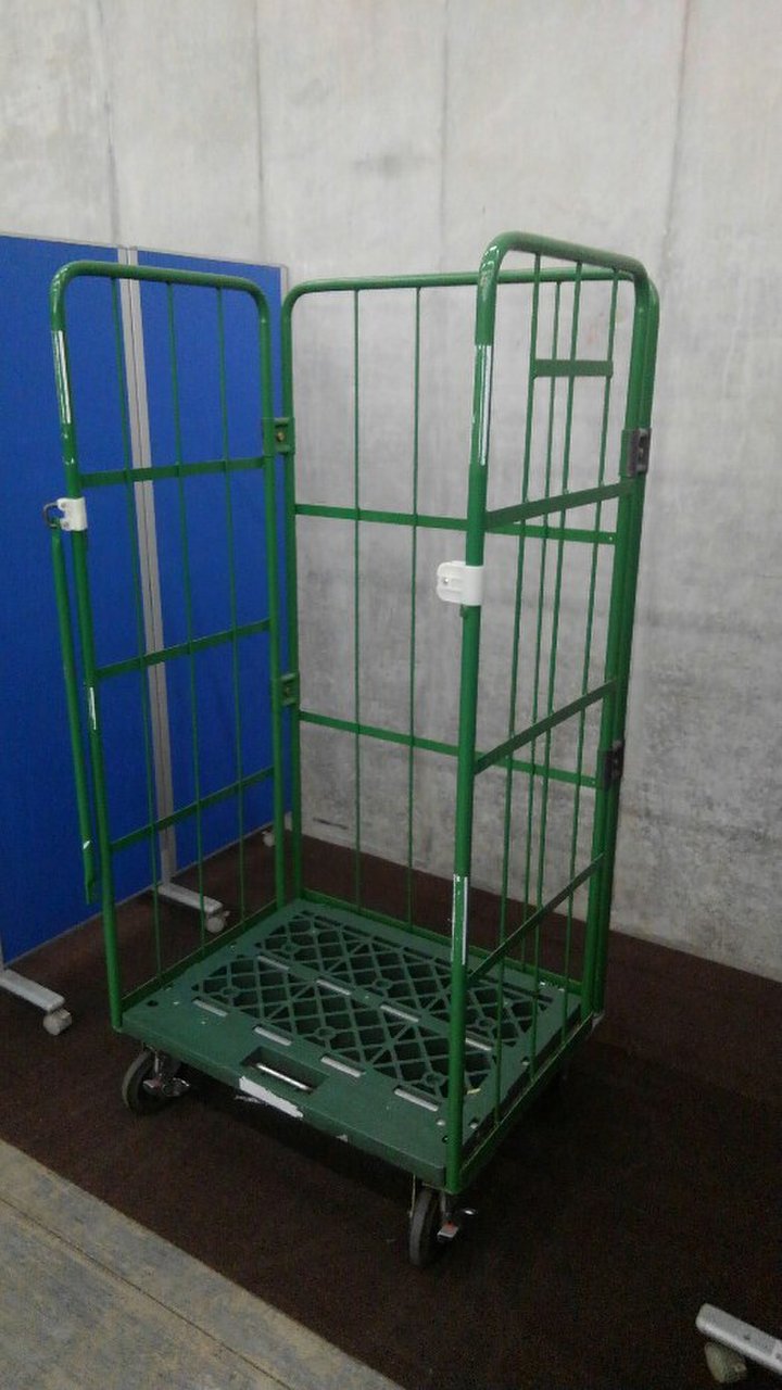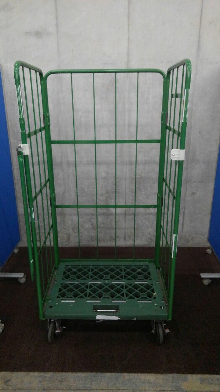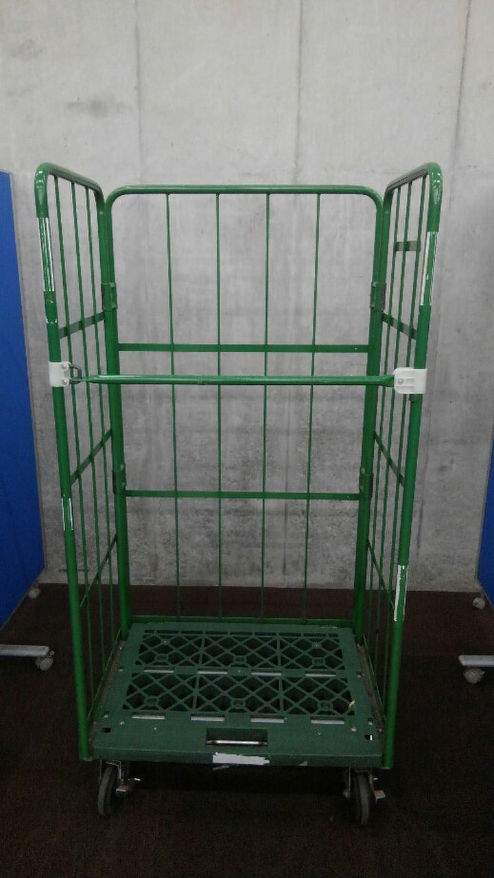 久しぶりにカゴ台車が入荷致しました!④ 前輪ストッパー付き!! 中板なし 最大積載荷重:500kgまで 外装・底板:グリーン色 ※マテハン本舗の中古商品は、千葉県柏市に在庫がございます。- マテハン本舗