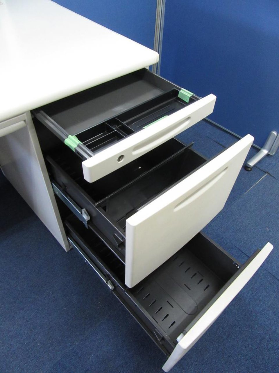 - 袖机のワゴンは、最下段がロング引出しになっており、従来より収納力120%アップ。