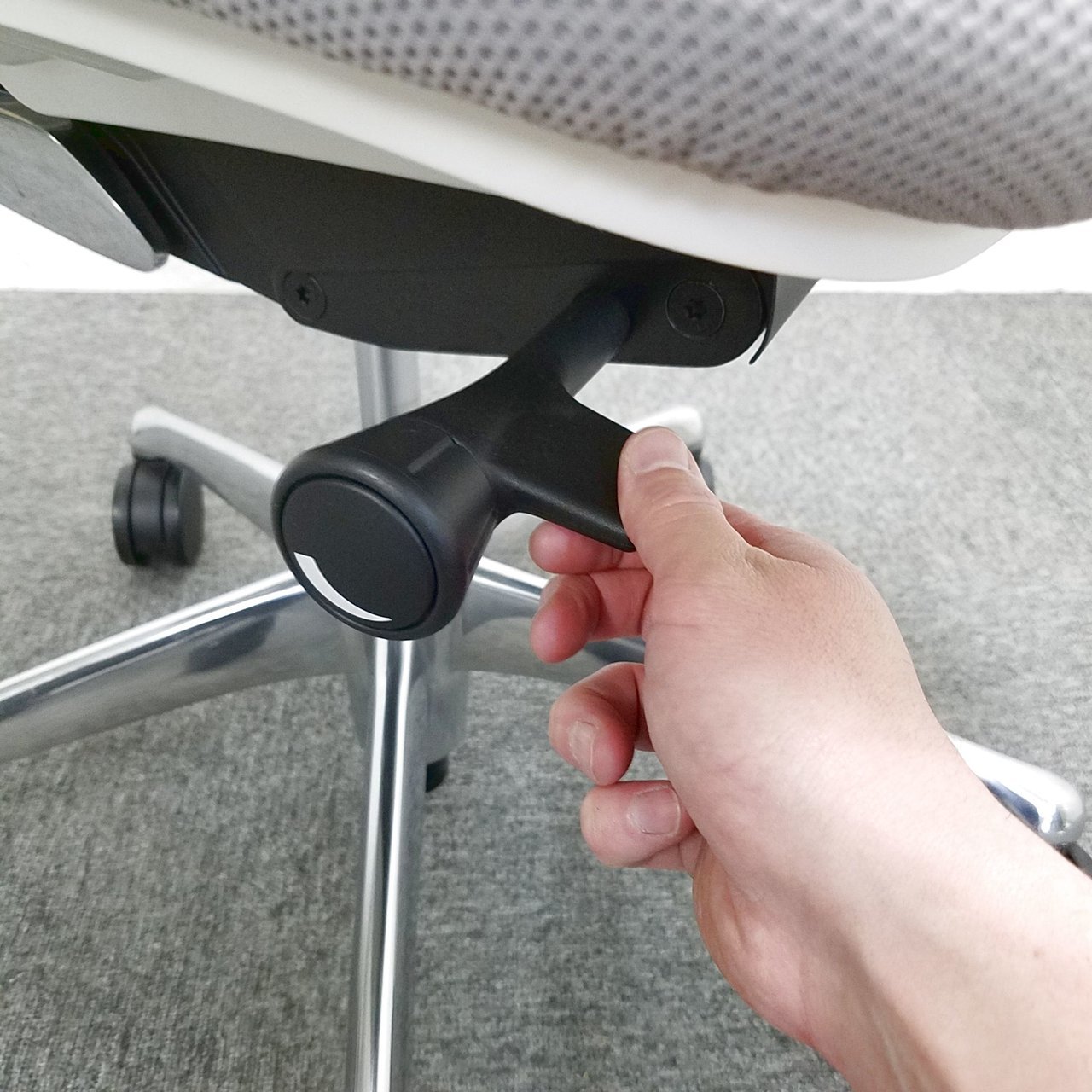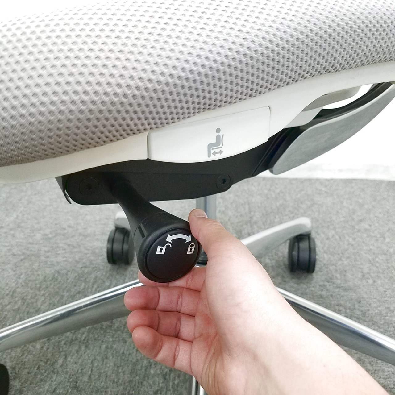 - 座面右下のレバーをスライドさせる「クイックスライドオペレーション」で、リクライニング反力を調整できます。強さの状態が視覚的にわかるため、直感的に操作がおこなえます。