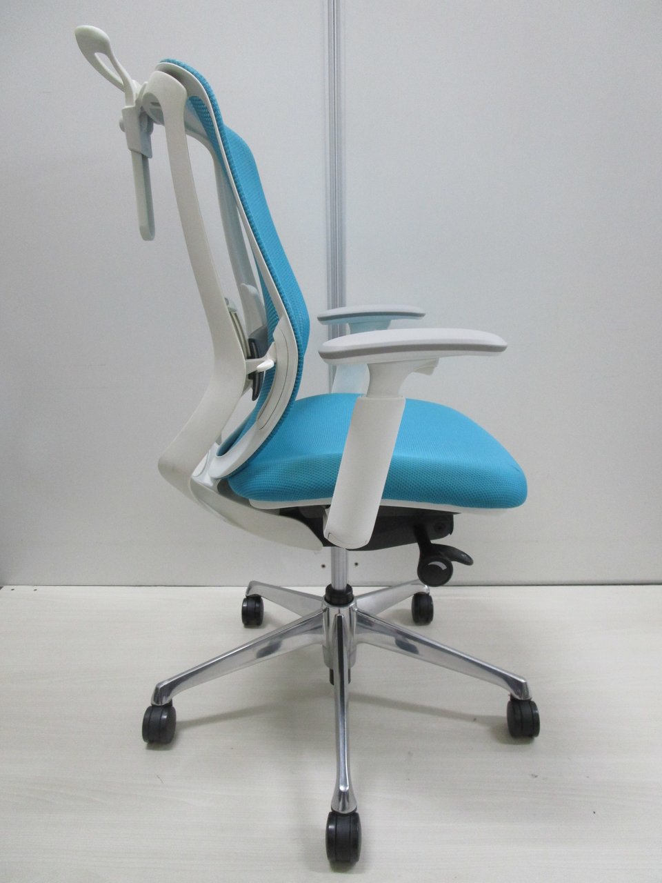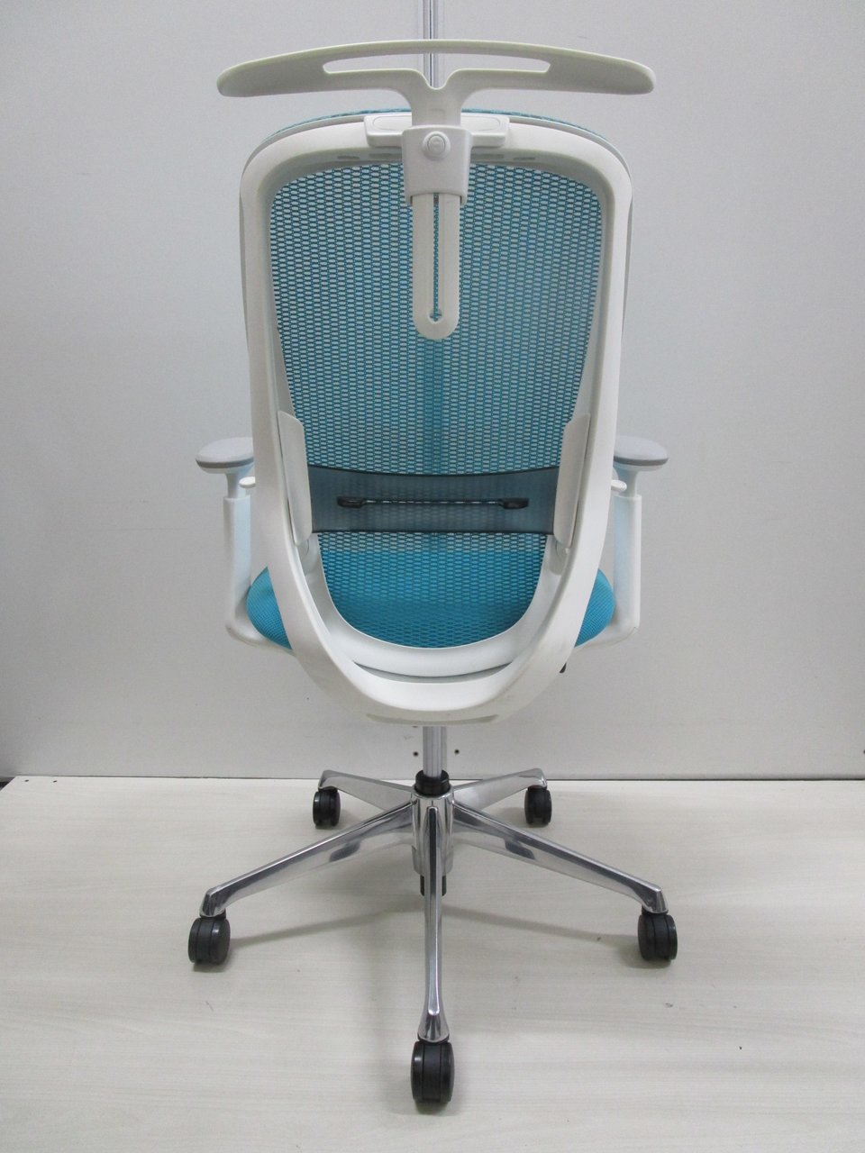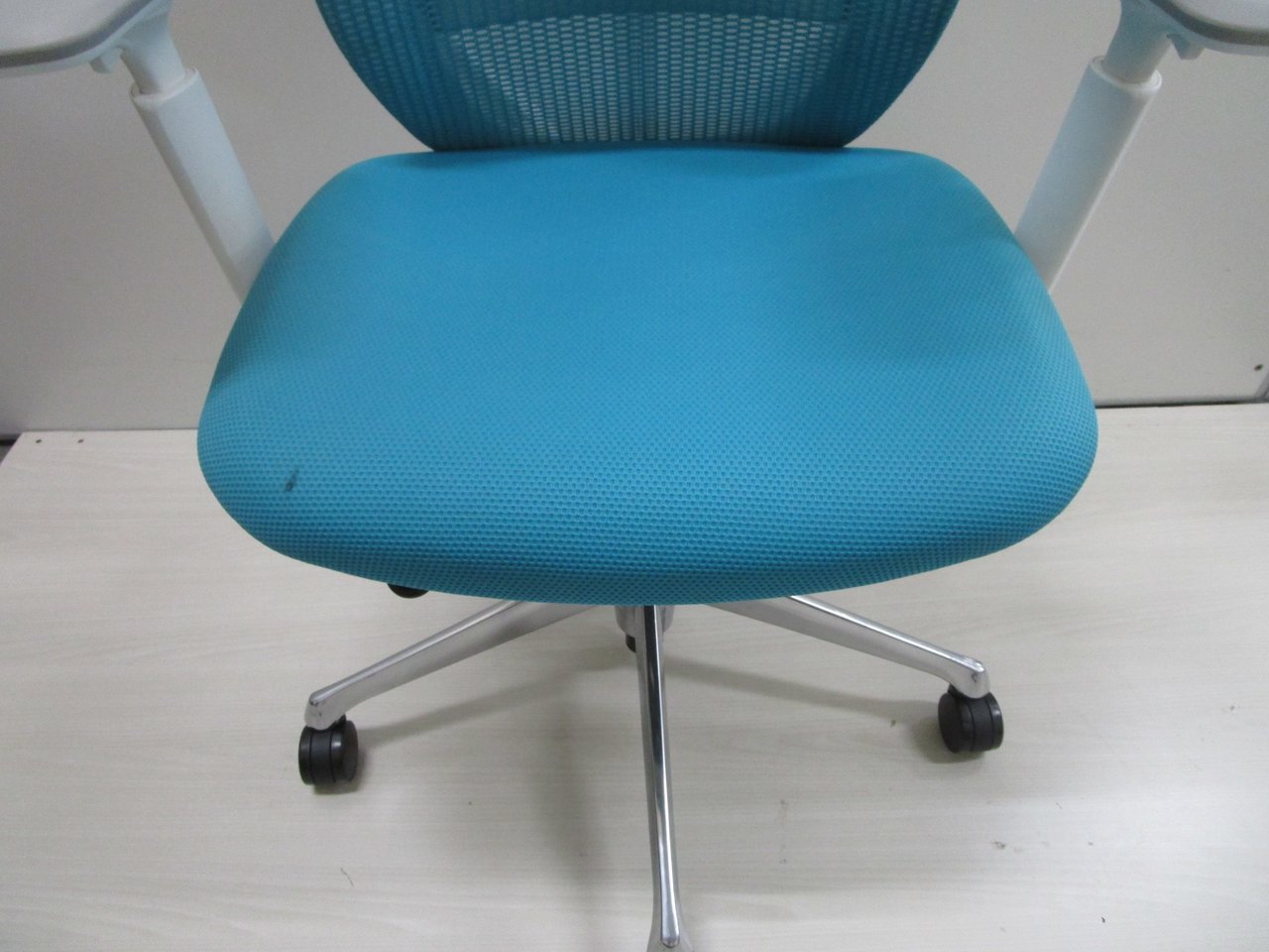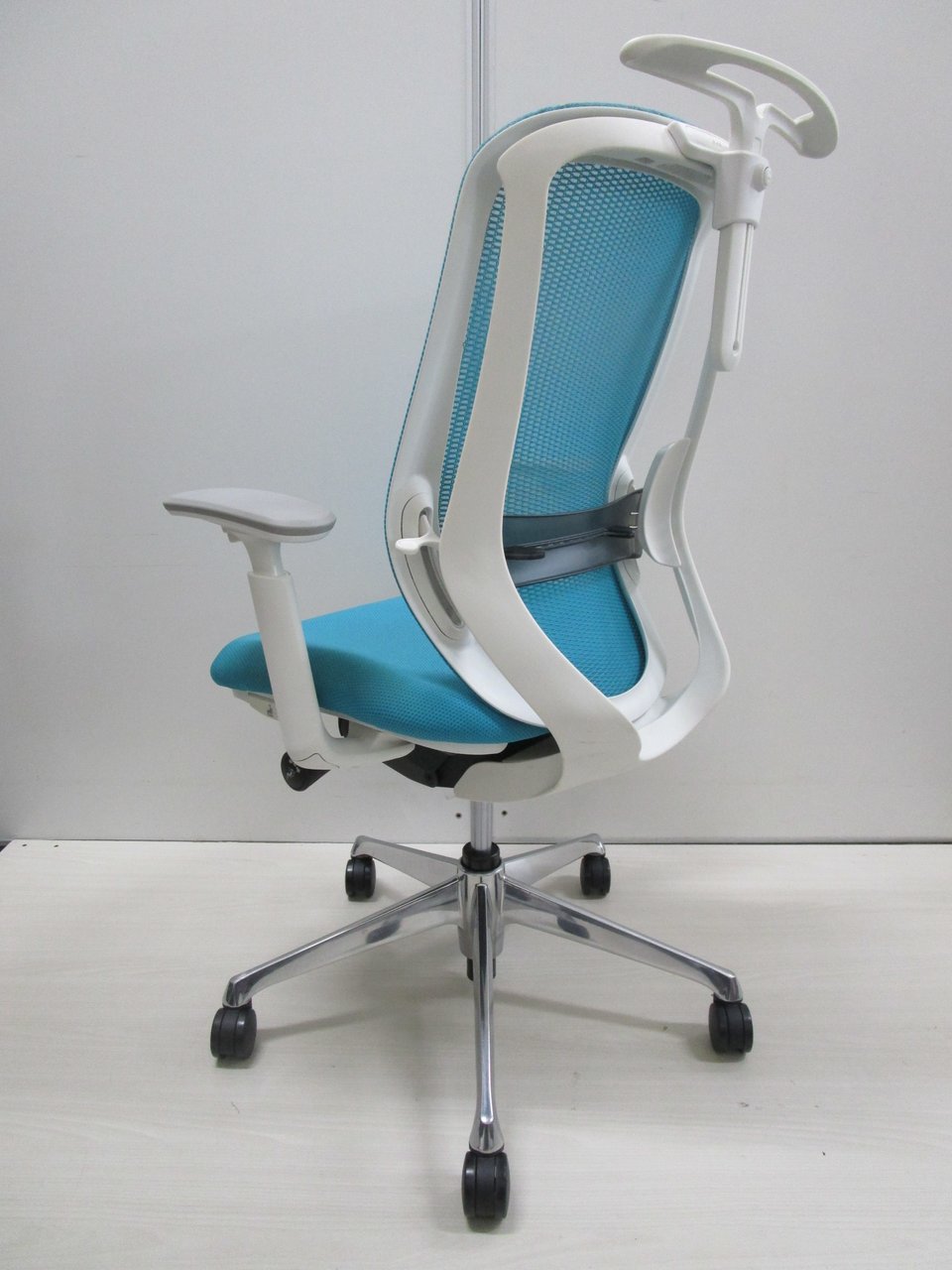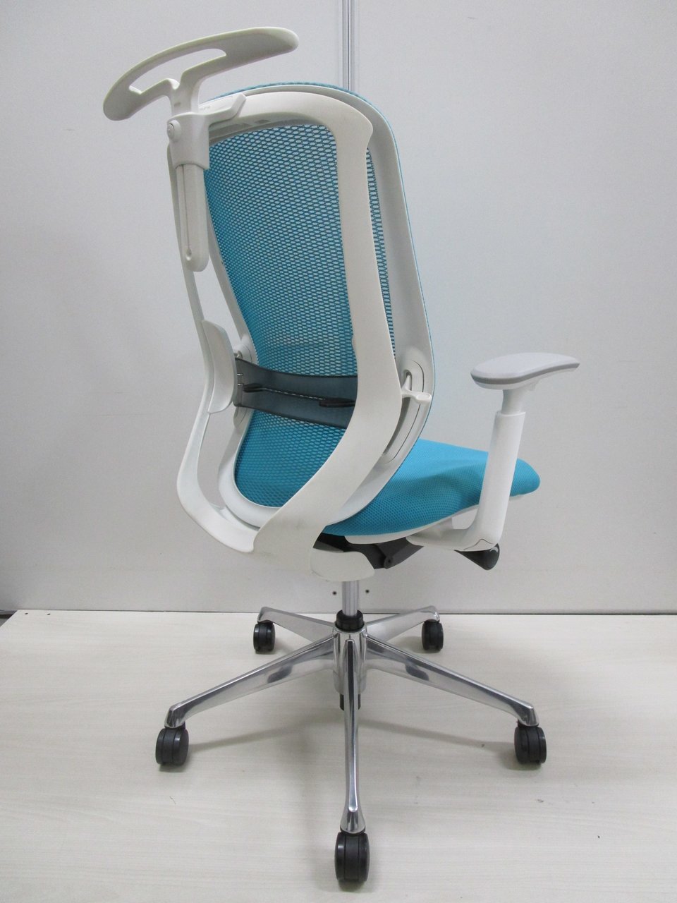 《現物写真だから安心!》オカムラ製の人気オフィスチェア【シルフィーメッシュ/可動肘/ヘッドレスト付き/ブルーグリーン】が先着1名様ご案内可能です!