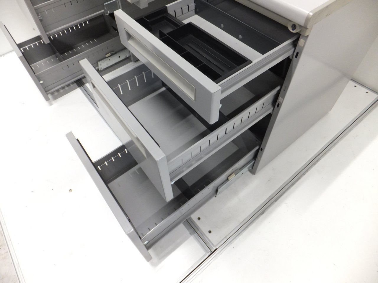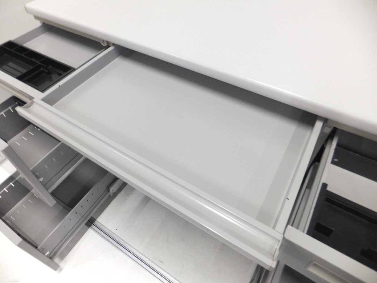 - シンプルながらも使いやすい工夫があります。ロックは、一度の施錠ですべての引出しの鍵がかかるオールロック機構。