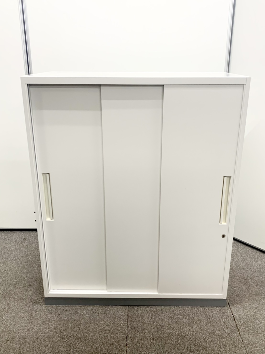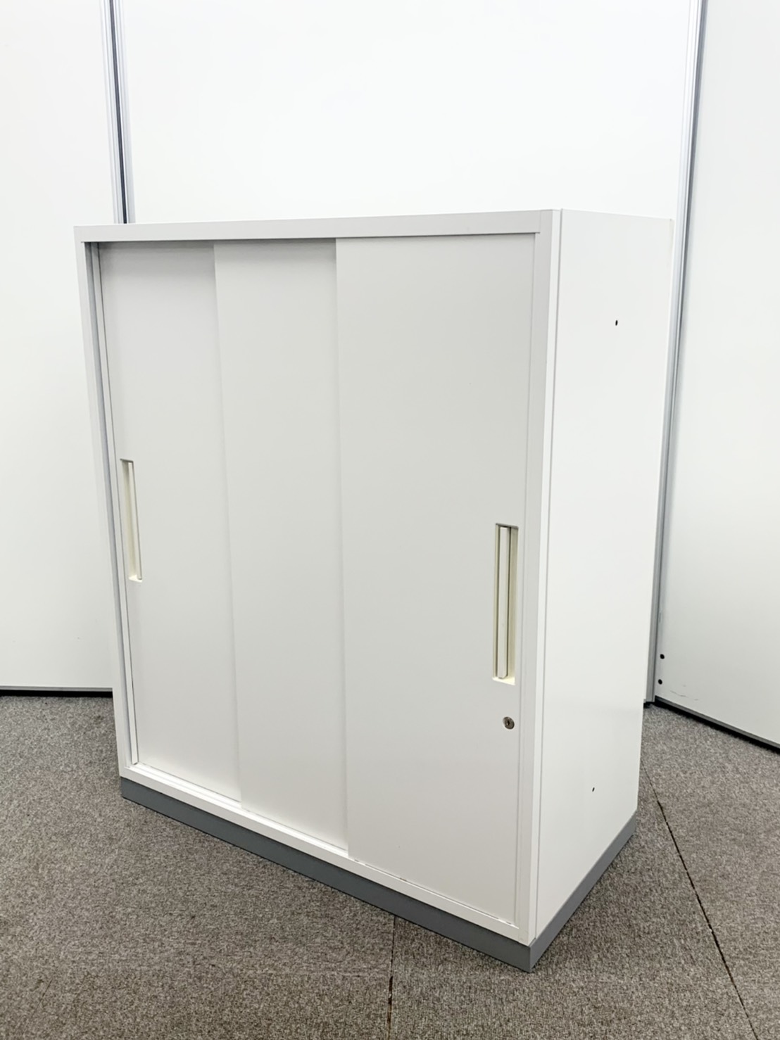 【人気の引き違い戸タイプ!取っ手が大きく使い勝手のよい定番キャビネット!】■イナバ(Inaba)製 TFシリーズ 引き違い書庫 ローキャビネット W900×D450㎜ ■ホワイト /ベース:グレー ■シリンダー錠 ※日焼けあり