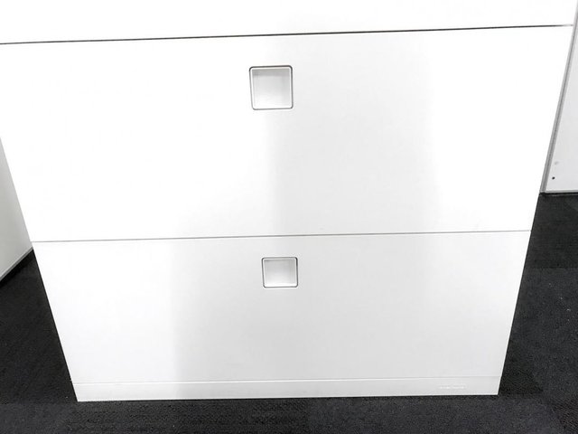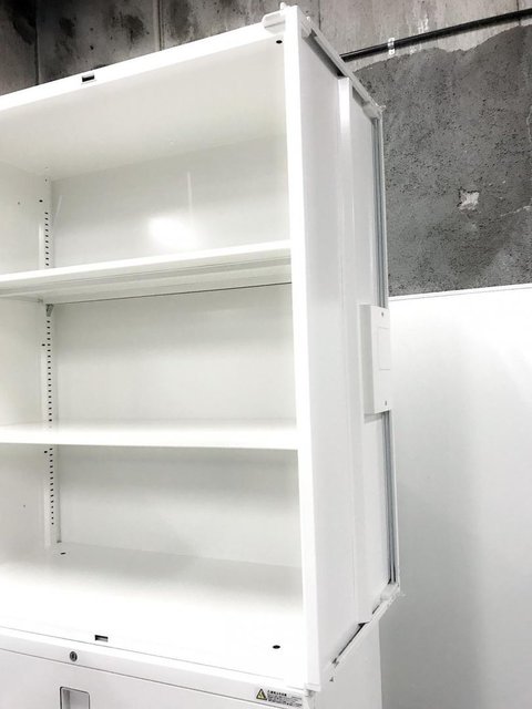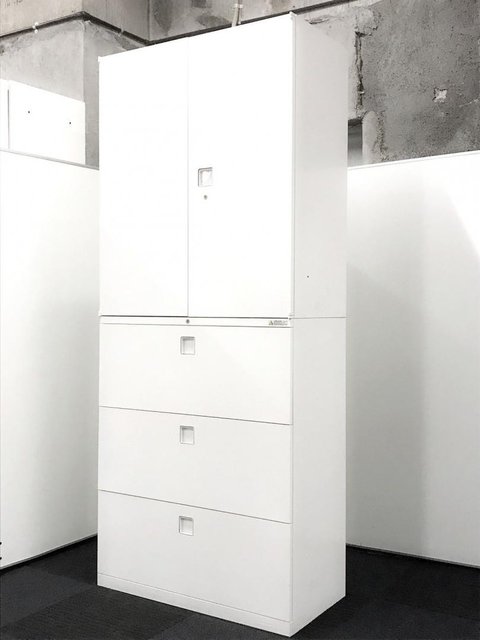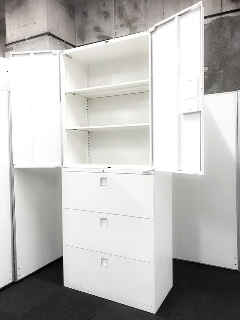 スライド式の扉+引き出しタイプの便利な書庫セットが入荷!使い勝手抜群のハイキャビネットが入荷! ■オカムラ/レクトライン/ホワイト 2枚引き戸+3段ラテラルキャビネット
