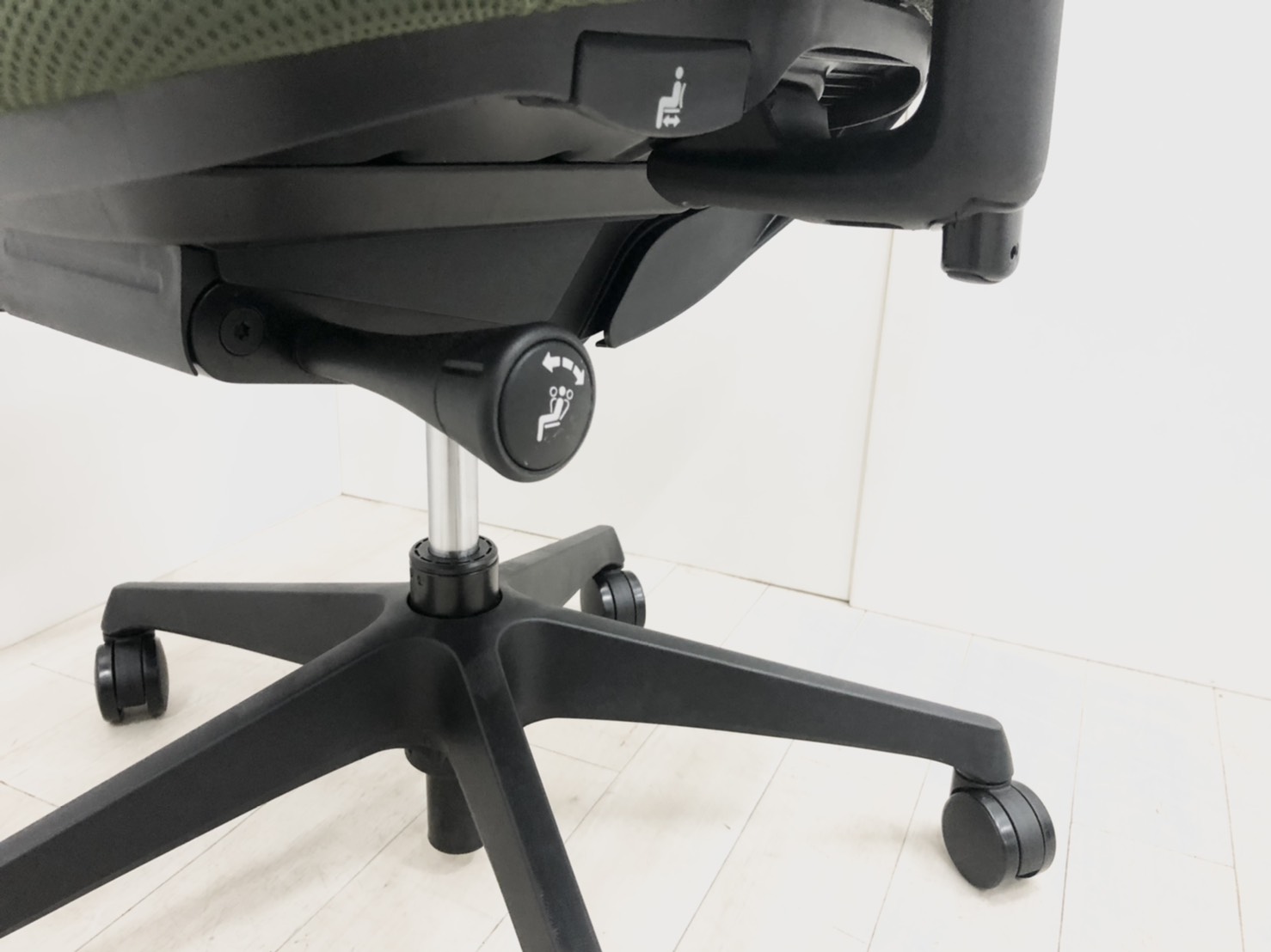 - 座面右下のダイヤル操作で、リクライニングの強弱調整が行えます。これまでのダイヤル式よりも、少ない回転数で、最弱?最強の調整が可能です。