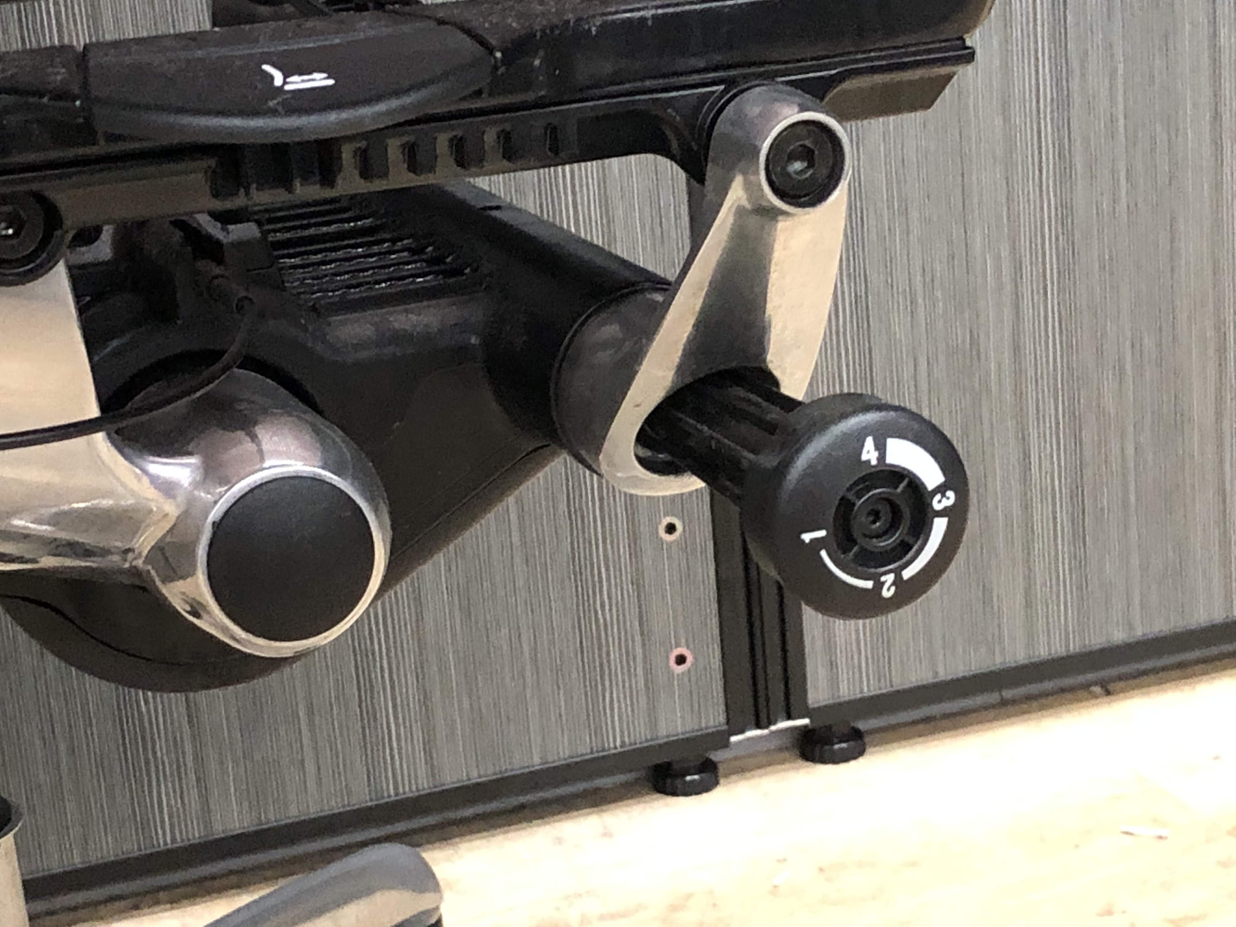 - ロッキングの強弱を調整するダイヤルがございます。体型に合わせてリクライニングの固さを座ったままで調整できます。