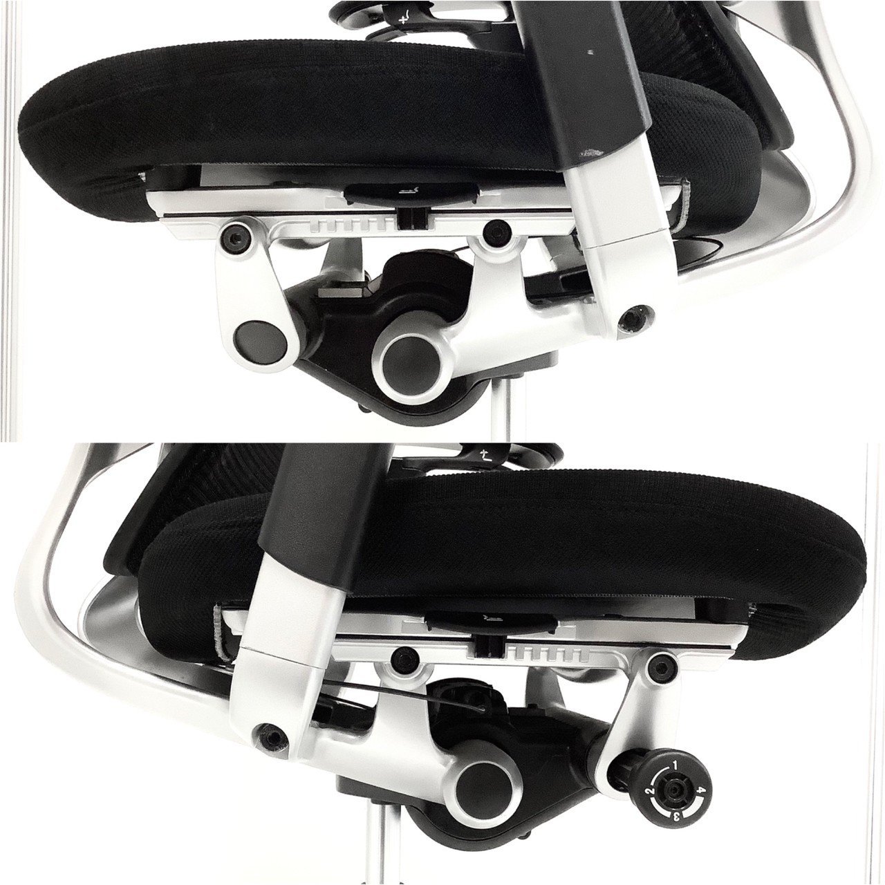 - 座面の前後スライド調整レバーで操作(前後50mm分調整で)できます。(グラデーションサポートメッシュタイプを除く)