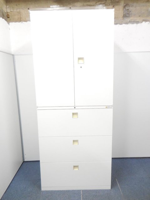 スライド式の扉+引き出しタイプの便利な書庫セットが入荷!使い勝手抜群のハイキャビネットが入荷! ■オカムラ/レクトライン/ホワイト 2枚引き戸+3段ラテラルキャビネット