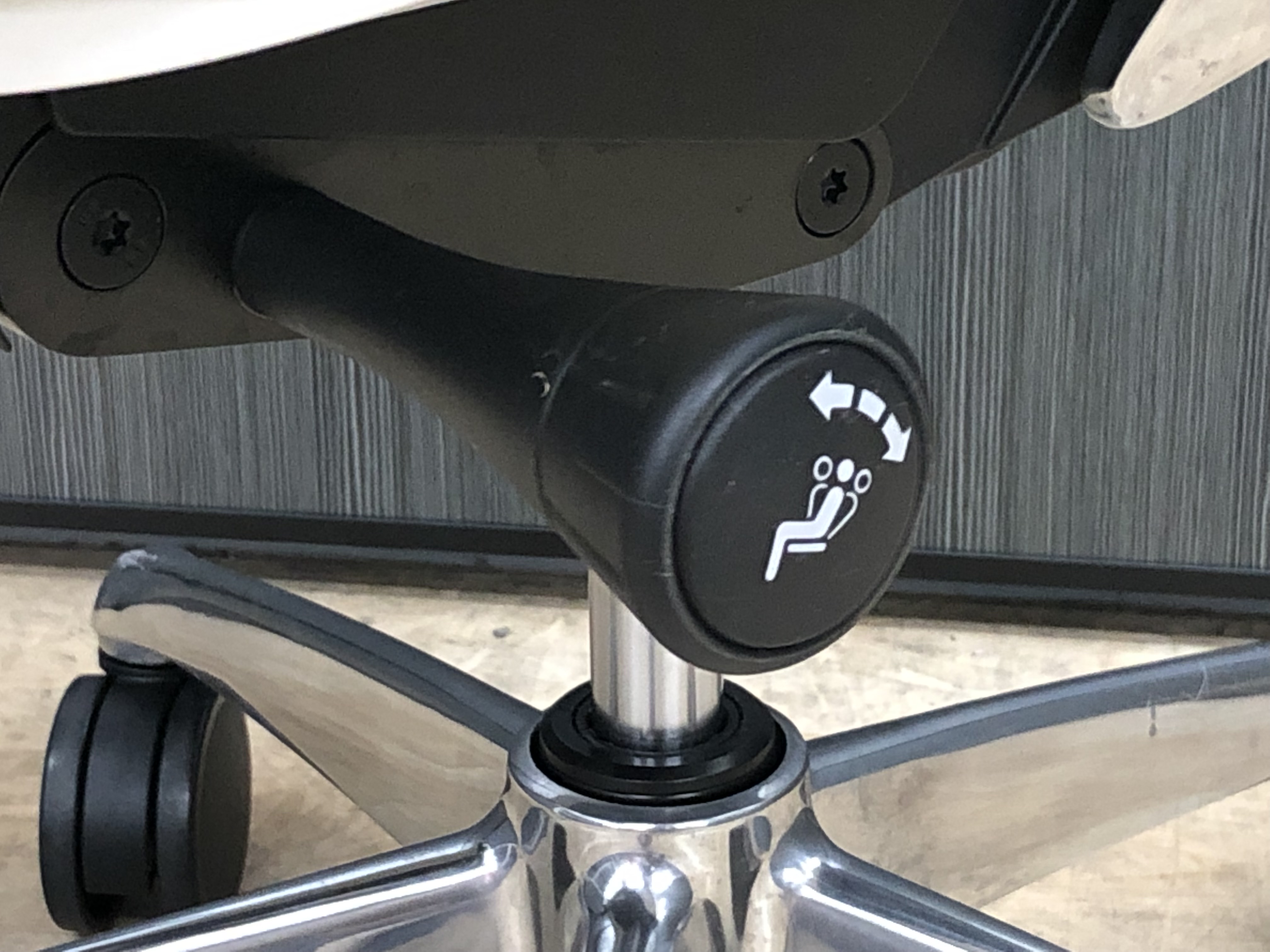 - 椅子と背が連動する「シンクロリクライニング」。リクライニング角度は直立ポジションから前方に10度、後方に23度です。