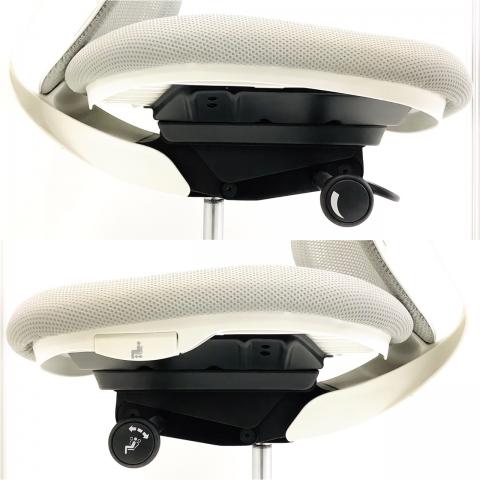 - 座面右下のダイヤル操作で、リクライニングの強弱調整が行えます。これまでのダイヤル式よりも、少ない回転数で、最弱?最強の調整が可能です。