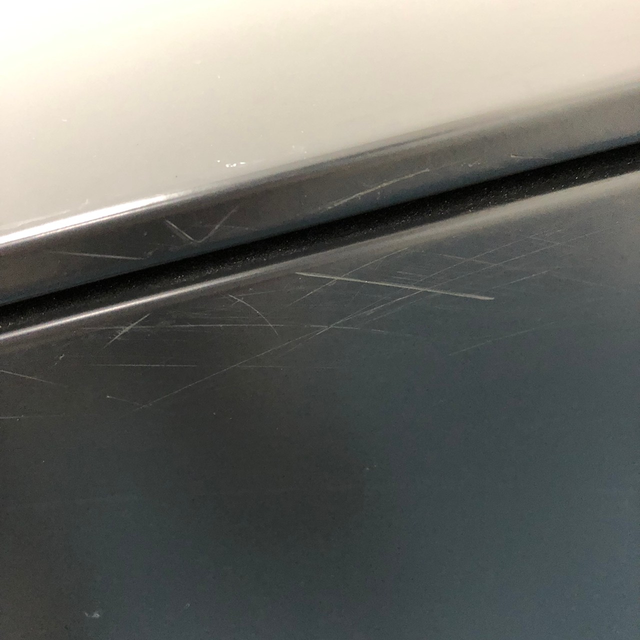 - 目立つ箇所あり傷・凹みが多数、深い傷・凹みが一部ある。(例、天板、正面、背後、サイド部分にある。)