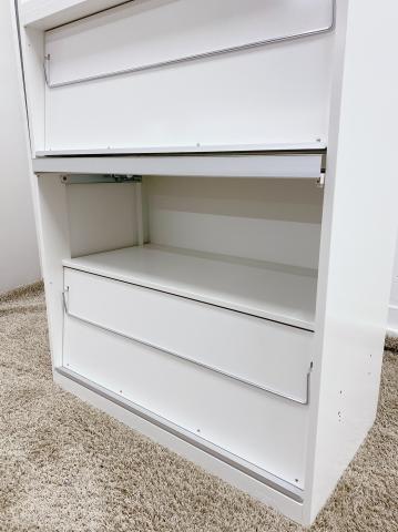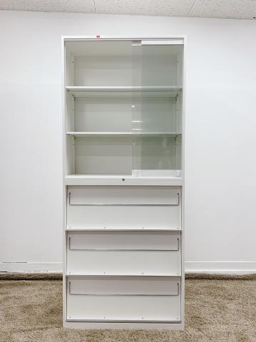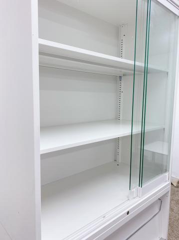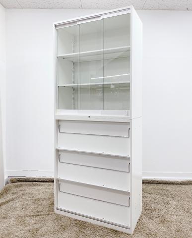 スライド式の扉+引き出しタイプの便利な書庫セットが入荷!使い勝手抜群のハイキャビネットが入荷! ■オカムラ/レクトライン/ホワイト 2枚引き戸+3段ラテラルキャビネット