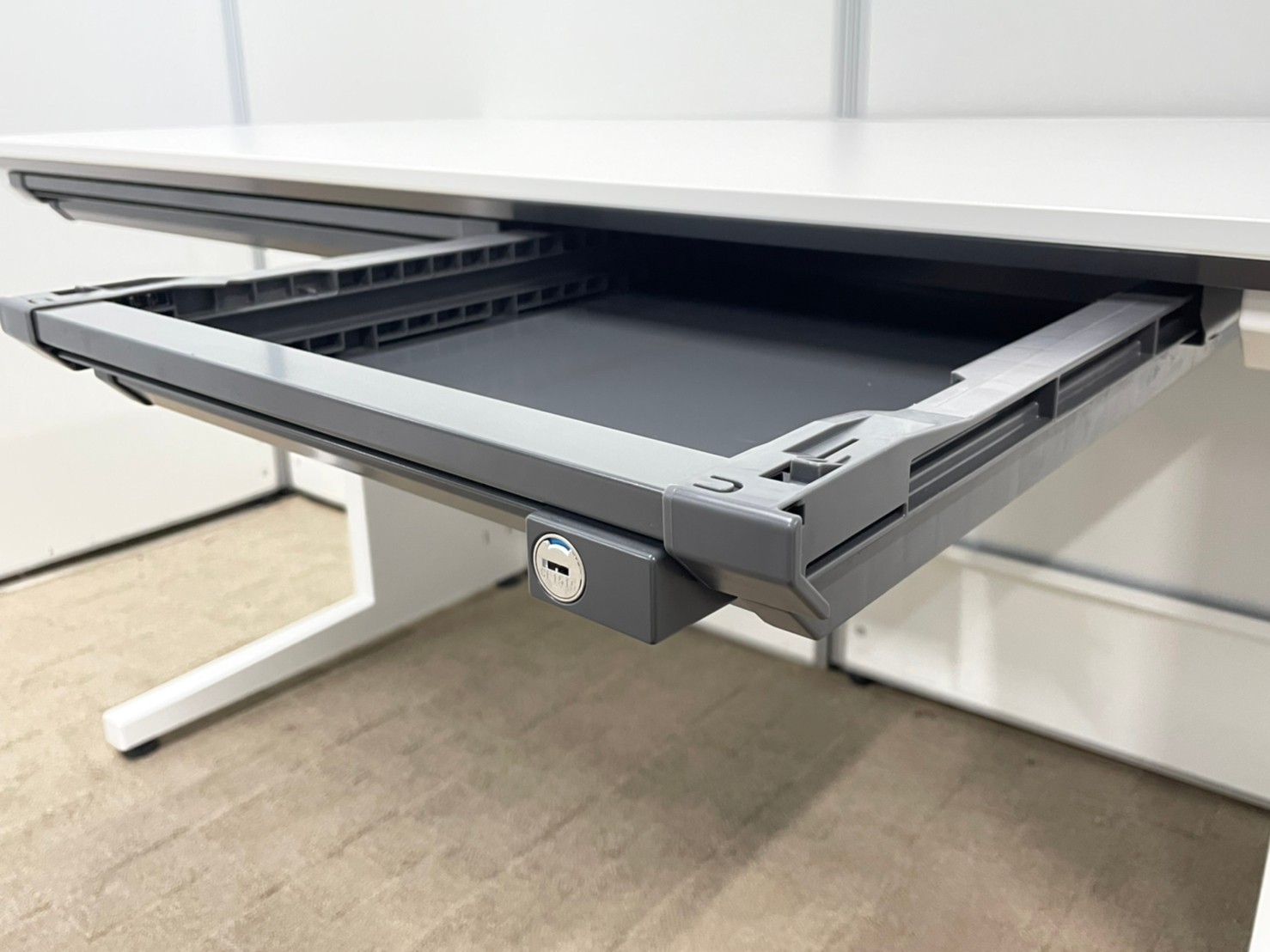 - 地震時、センター引出しが飛び出さないよう、ラッチ機構を装備。脚はデスクの横ズレを軽減させる設計になっています。