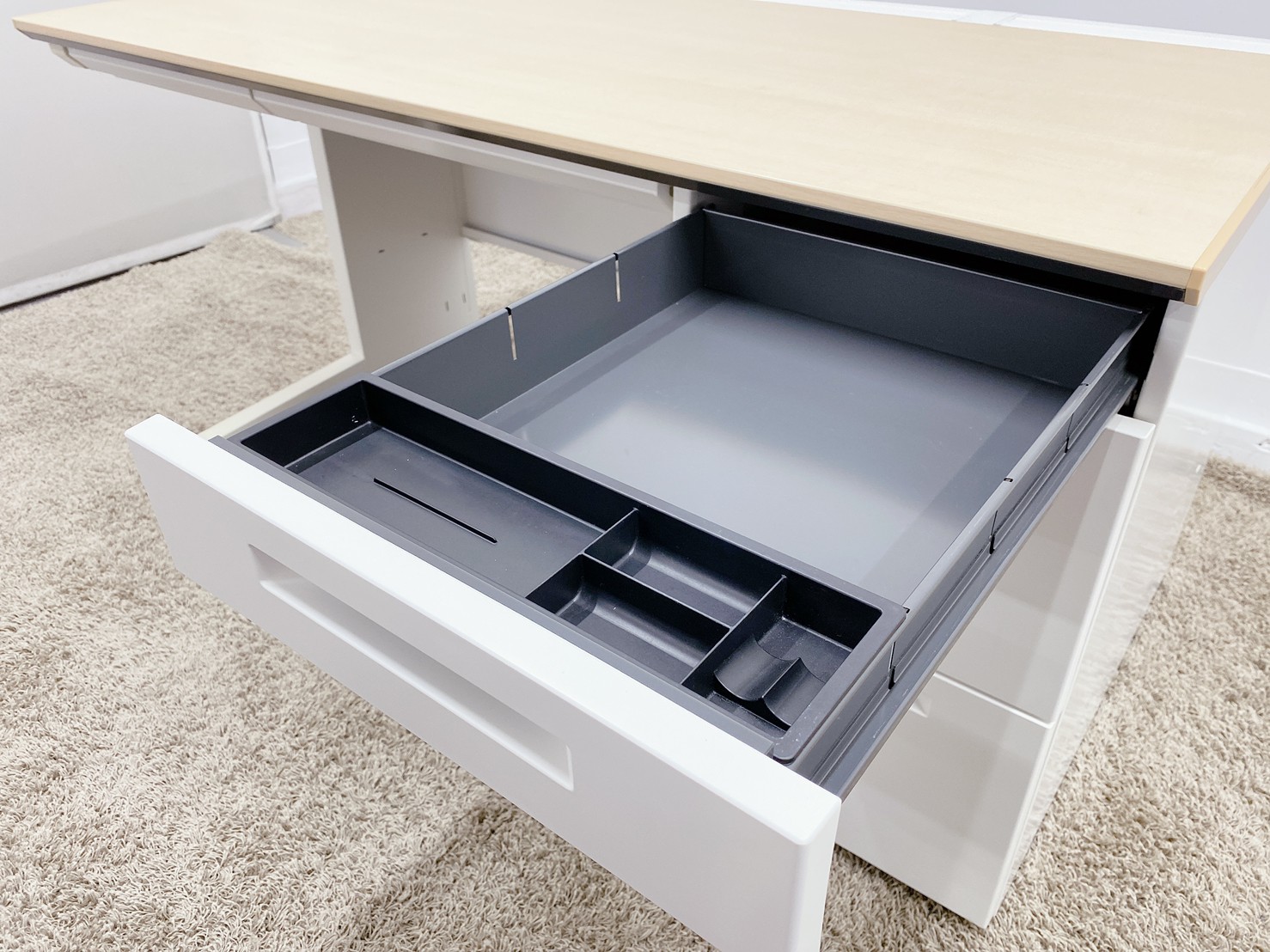 - 地震時、センター引出しが飛び出さないよう、ラッチ機構を装備。脚はデスクの横ズレを軽減させる設計になっています。