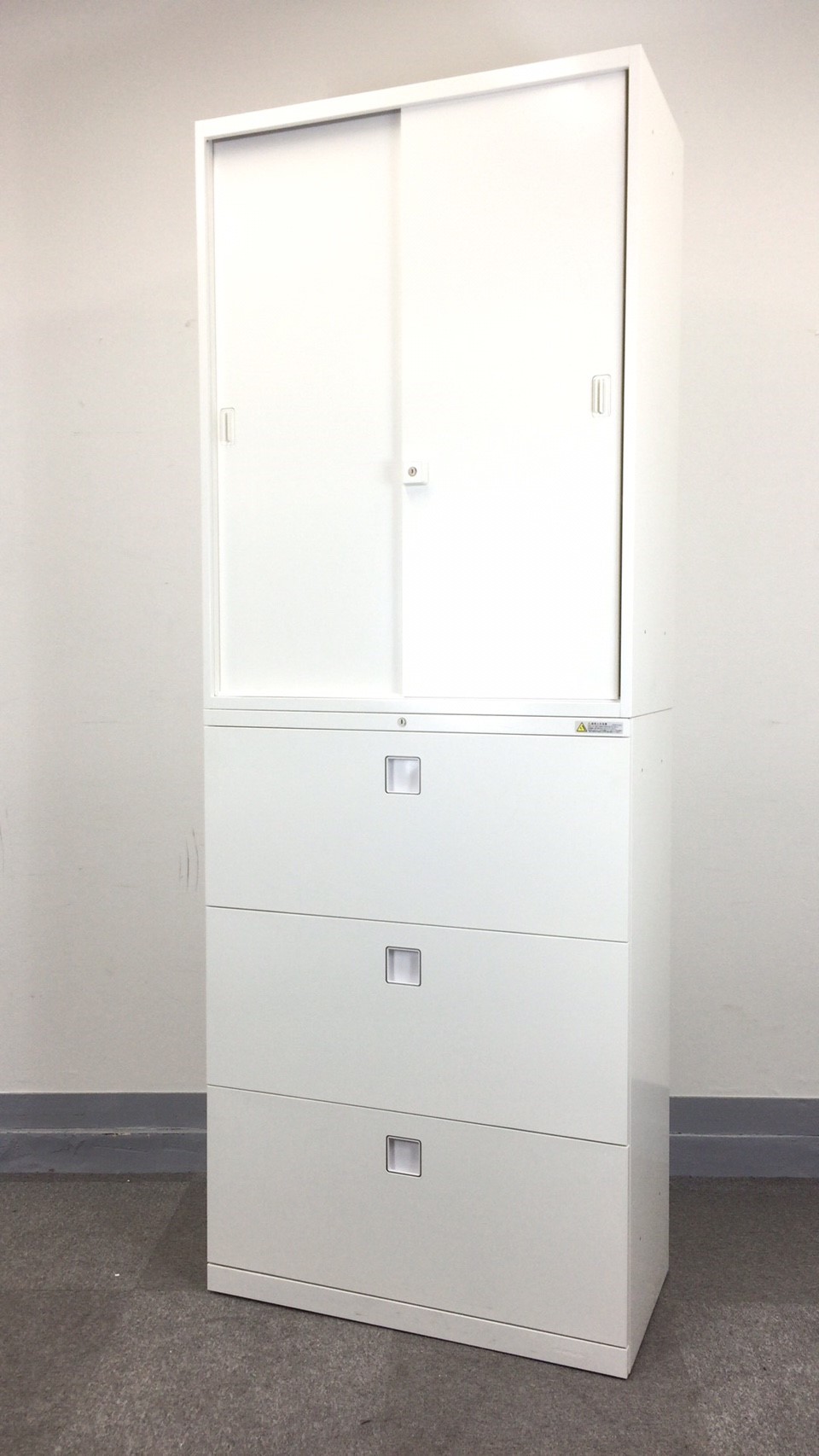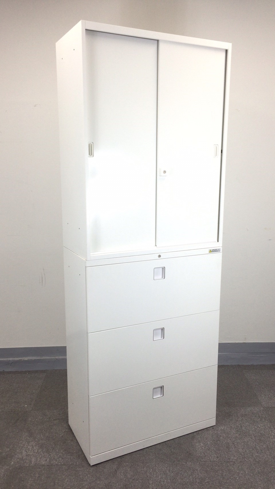 スライド式の扉+引き出しタイプの便利な書庫セットが入荷!使い勝手抜群のハイキャビネットが入荷! ■オカムラ/レクトライン/ホワイト 2枚引き戸+3段ラテラルキャビネット