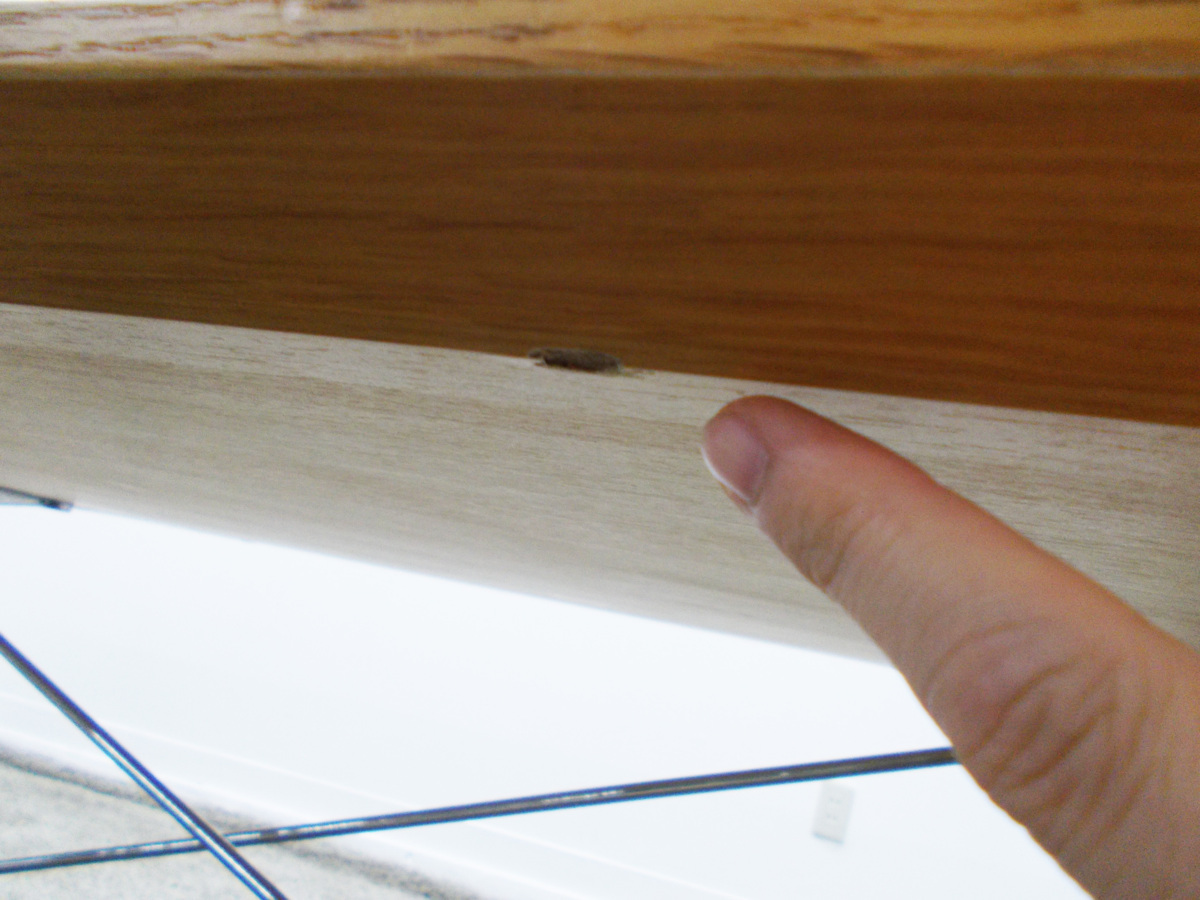 - かなり強い濃い黄ばみ・変色が商品全体にある。(例、天板、幕板、棚板、サイド部分、脚部等にある。)