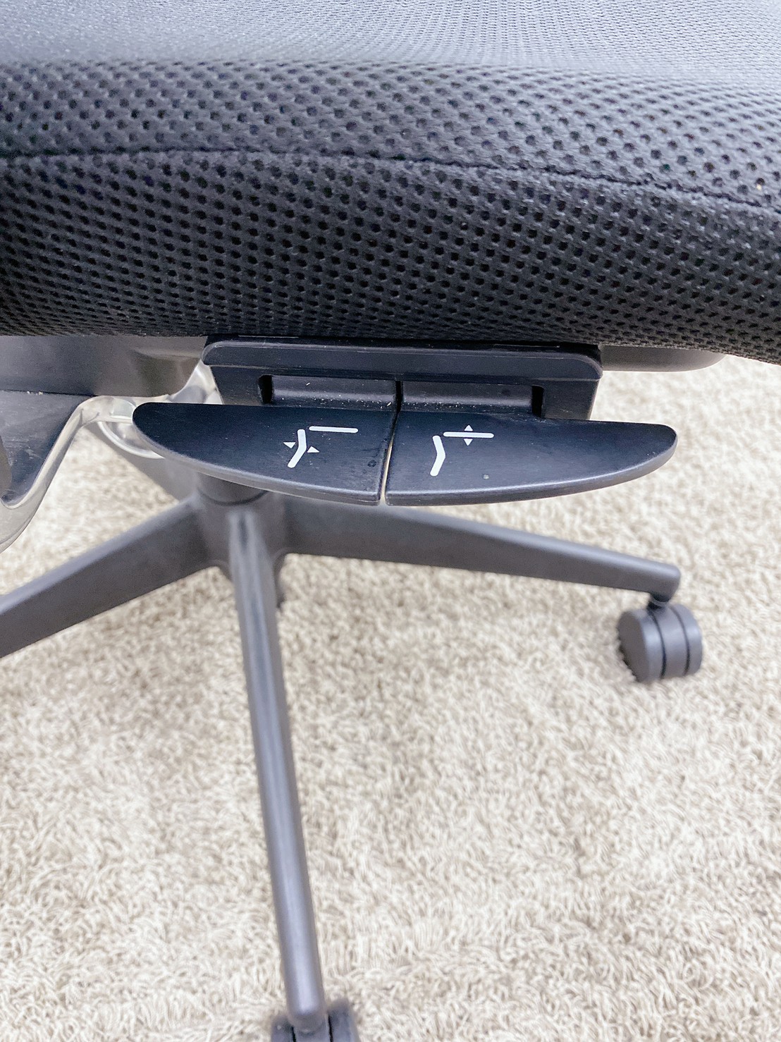 - 座る人の体重に合わせて、ロッキングの強さが自動調整される機構。背は3段階で固定でき、不用意なレバー操作による跳ね返りを防ぐアンチキックバック機能を採用しました。