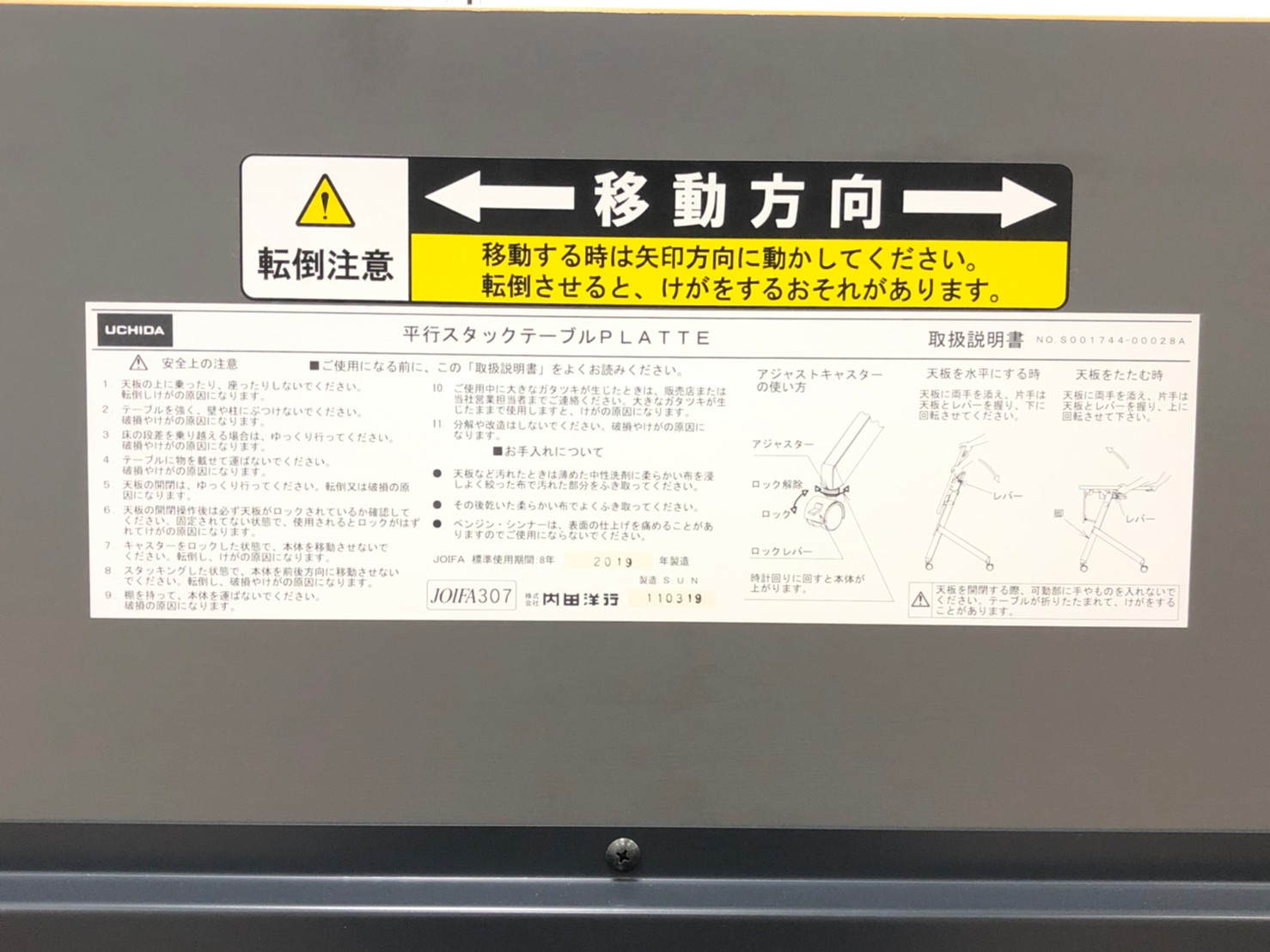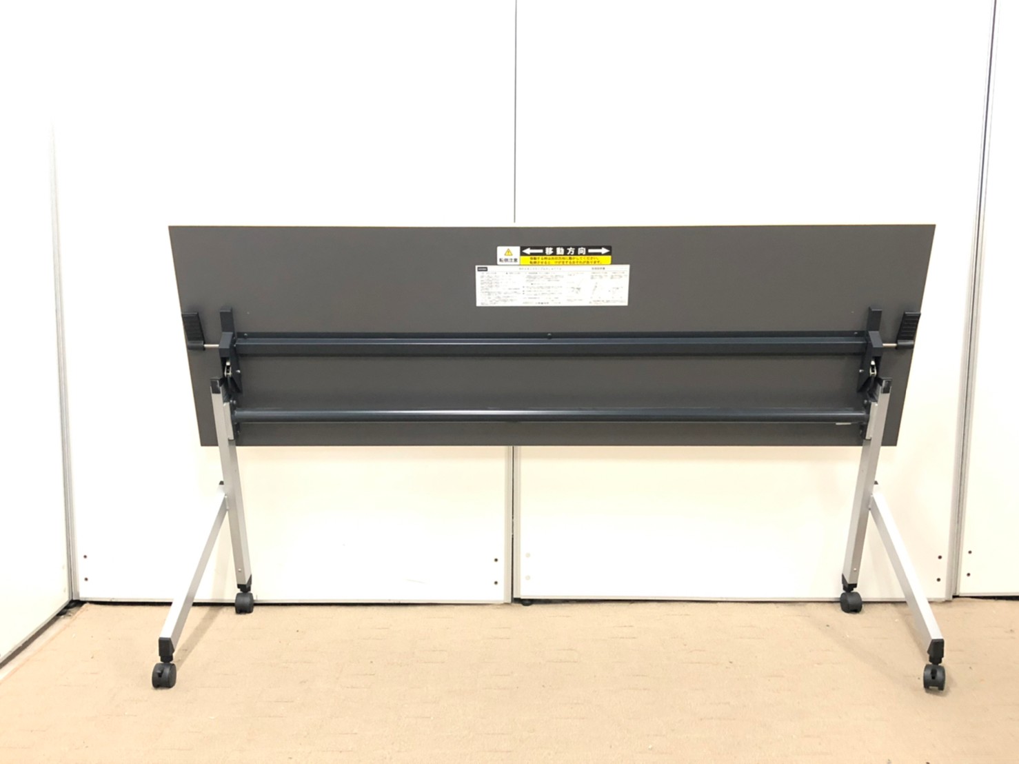 - 一部不具合あり天板歪み、アジャスター無し、キャスター使用不可ようなそのテーブルの本来の効用を果たすための機能以外の一部が使用不可な状態。(例、キャスターロッ ク機能使用不可、棚板無し等がある。)