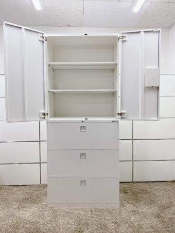 【大量収納の上下書庫!パッと見でわかるオープンタイプと鍵付き引き出しのラテラルセット】オカムラ レクトライン 上下書庫(上:オープン 下:3段ラテラル) 《オフィスバスターズ福岡博多店は、福岡を拠点として、日本全国へ中古オフィス用品・オフィス家具を提供しております》