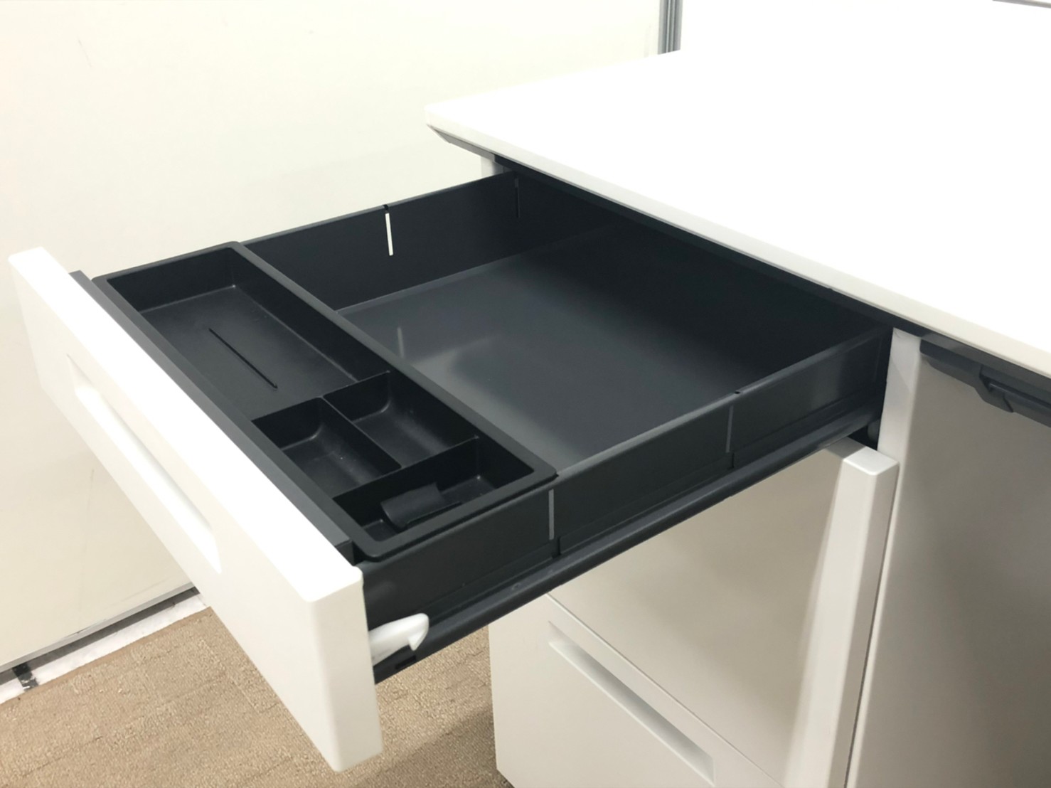 - 地震時、センター引出しが飛び出さないよう、ラッチ機構を装備。脚はデスクの横ズレを軽減させる設計になっています。