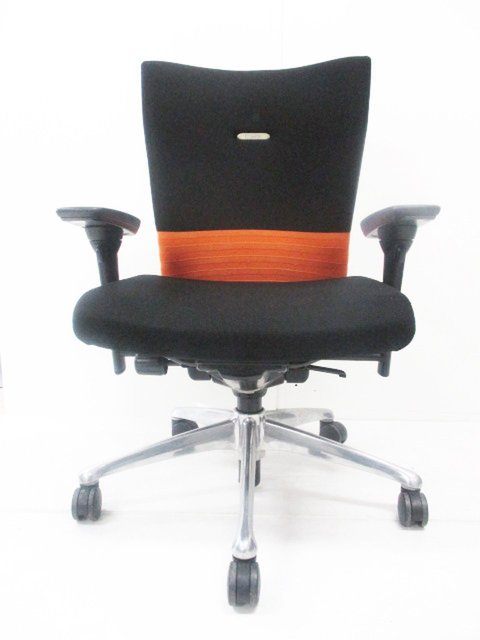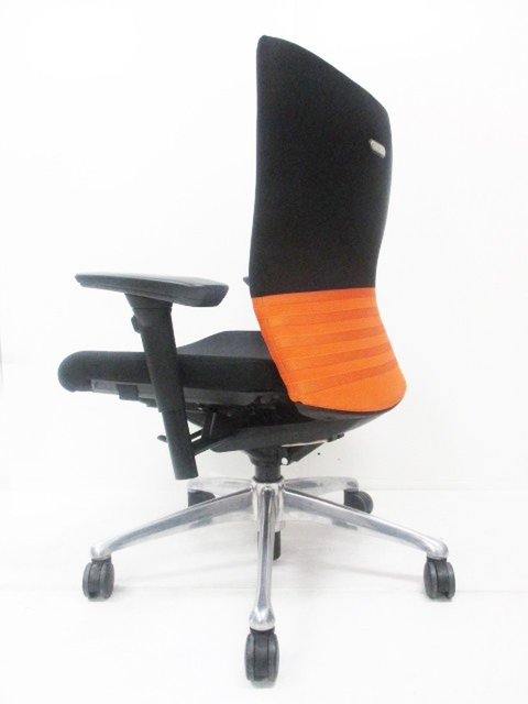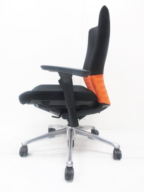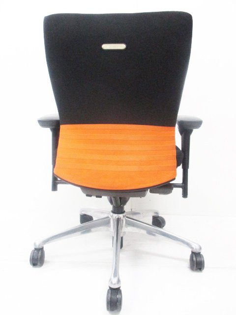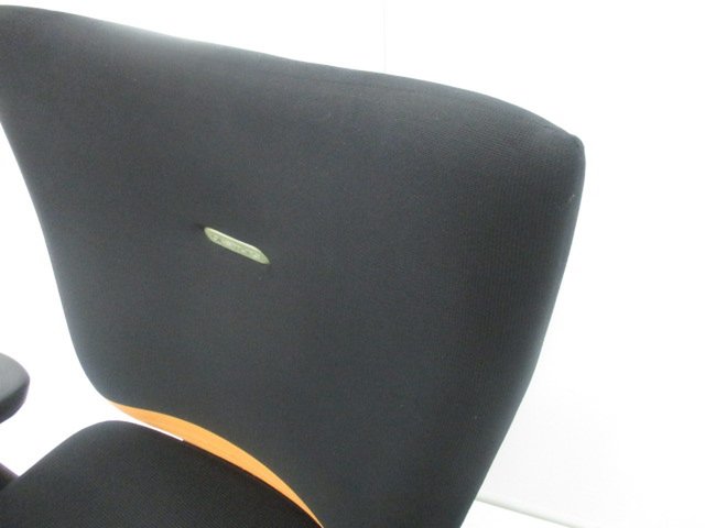 【人間工学に基づいた快適な座り心地!背あてのしなやかな曲線が背中にフィット!】■オカムラ製 フィーゴチェア (feego) 肘付きミドルバック シームレスタイプ ■固定肘 ■ブラック×オレンジ ※コートハンガー外し跡のある商品となります。【入替セールにつき30%OFF!】
