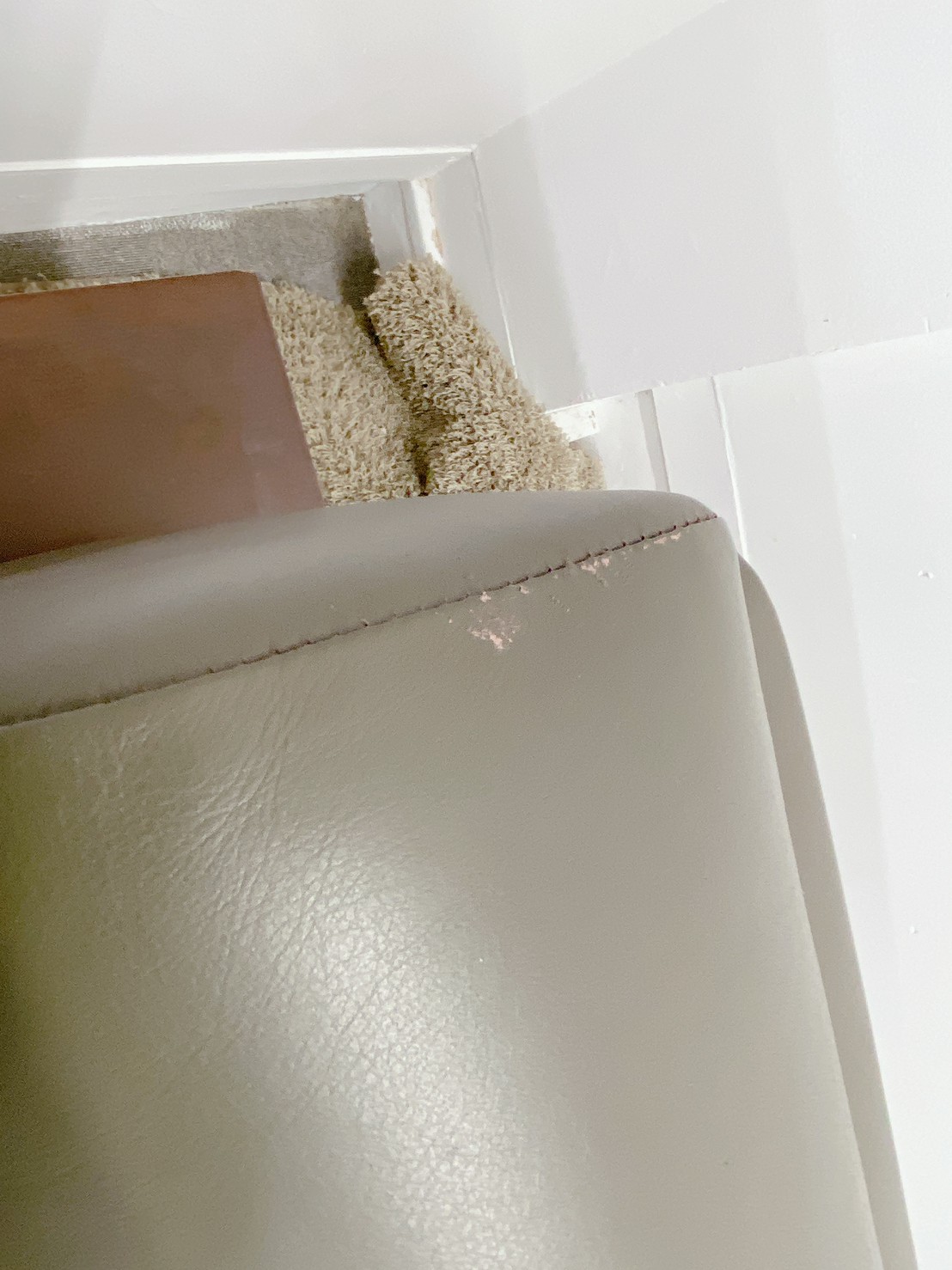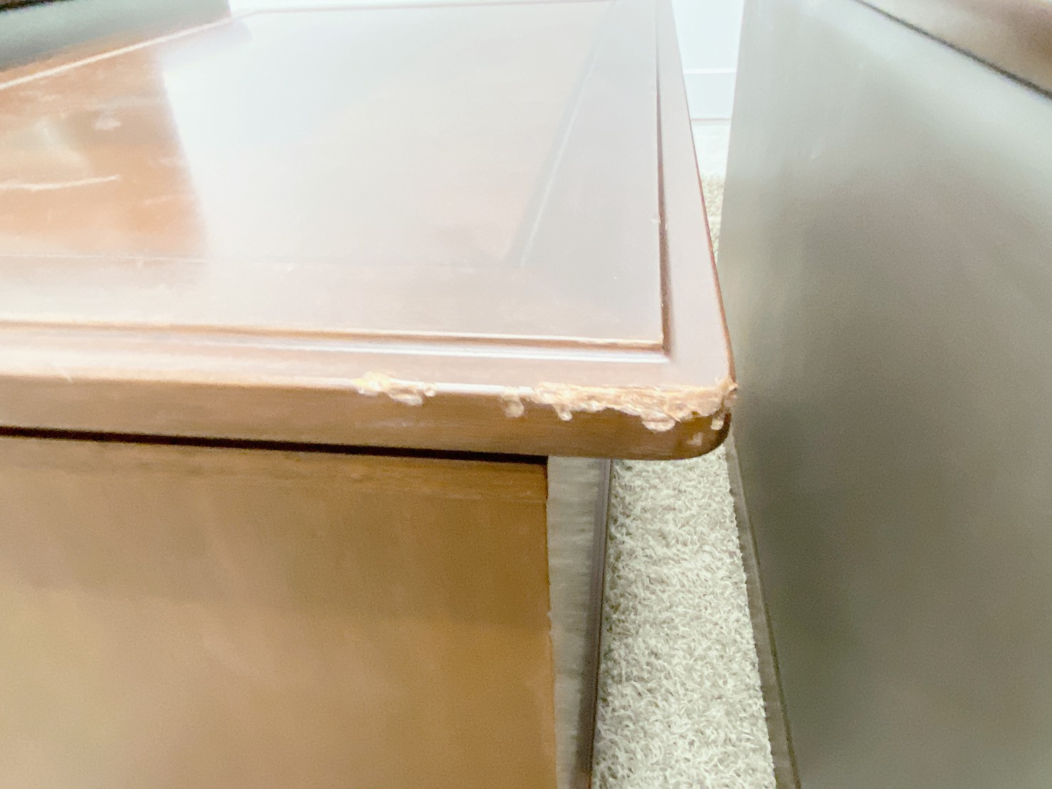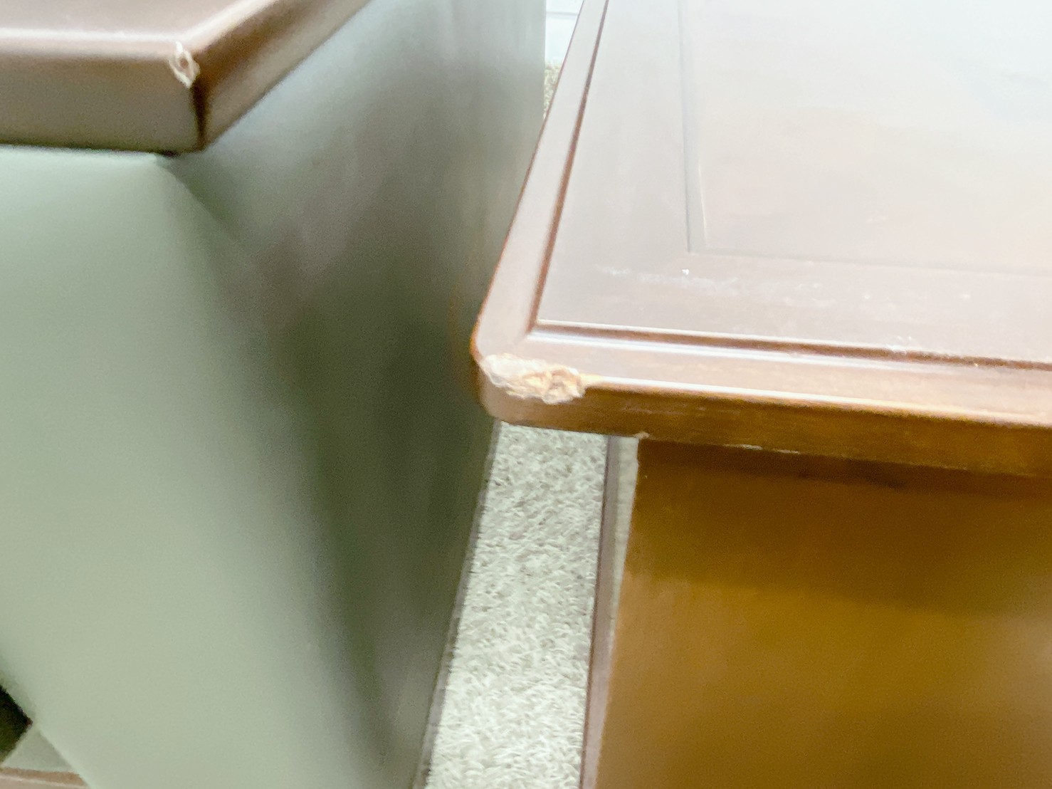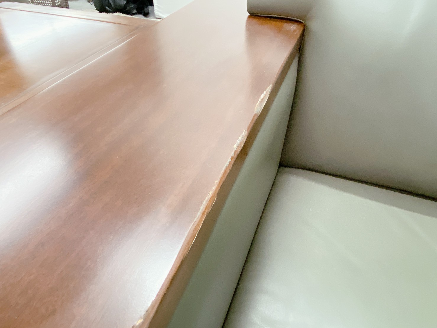 - あり黄ばみ・変色が広い範囲にうっすらある、または濃い黄ばみ・変色が一部ある。(例:三人用ソファ、二人用ソファ、一人用ソファの場合、背もたれ、肘かけ、座面等、 センターテーブルの場合、天板、脚にある。)