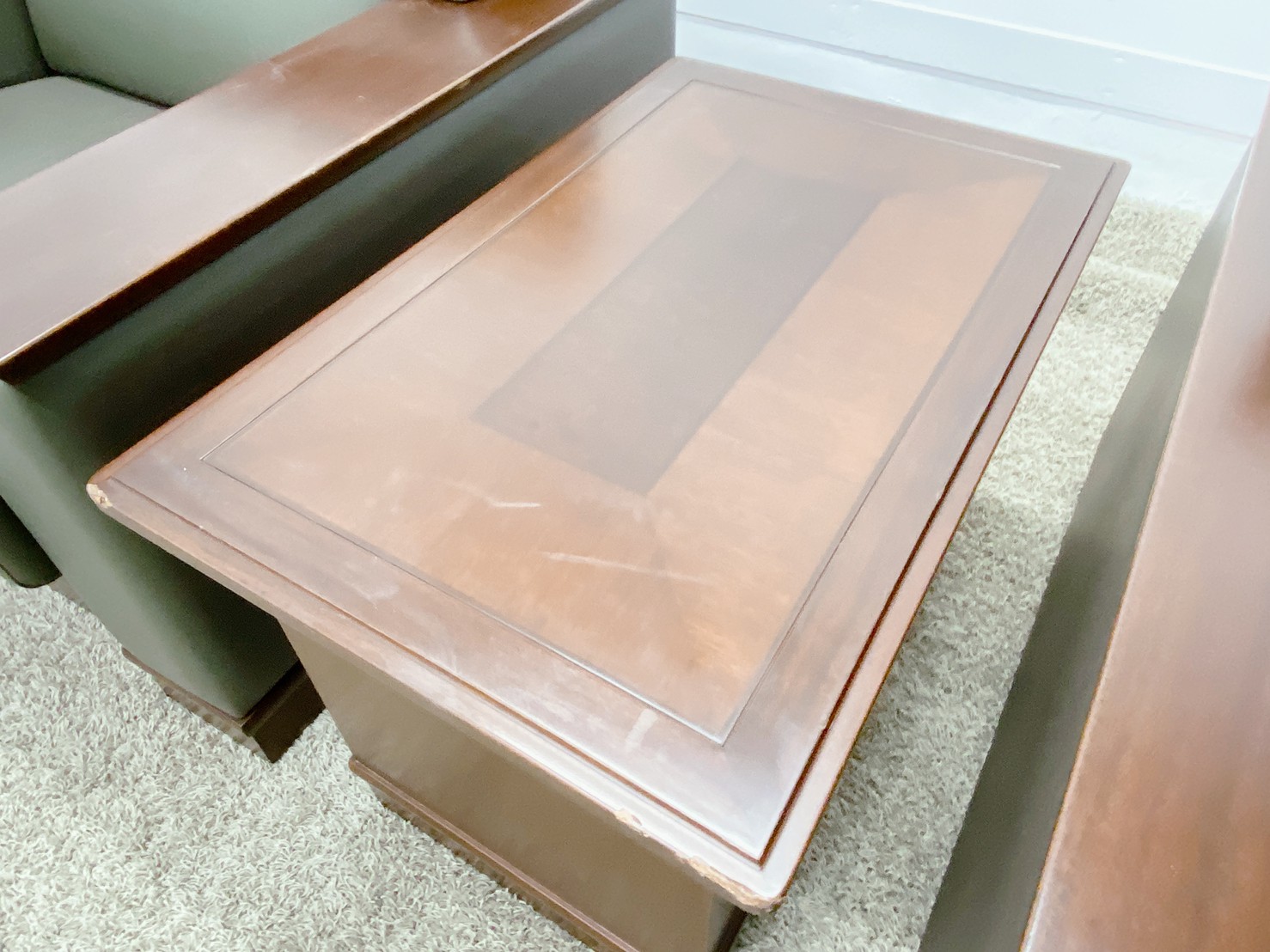 - 若干ありソファの場合、破け、ホツレ、へたり、しわ等が一部ある。(例、背もたれ、肘かけ、座面等にある。)センターテーブルの場合、傷・凹みが一部ある。(例、天板、 脚にある。)