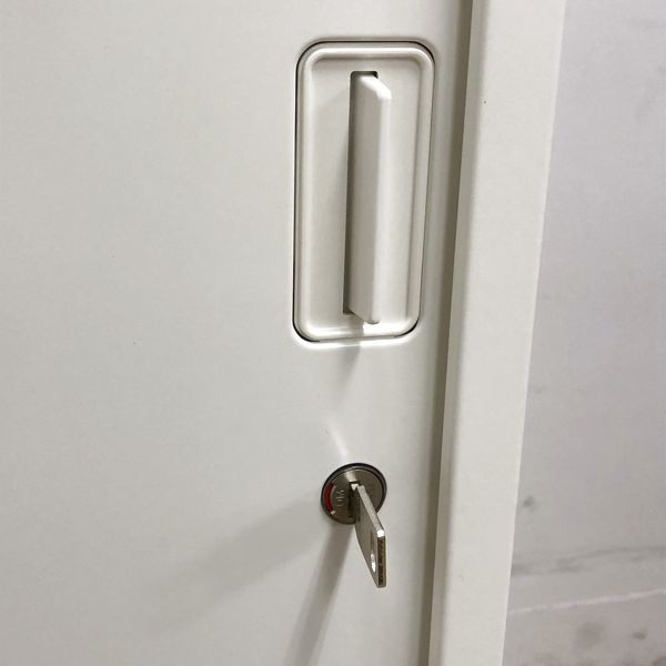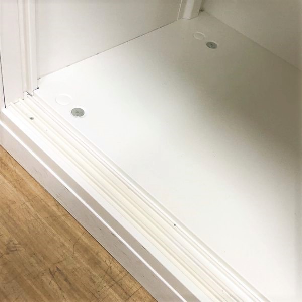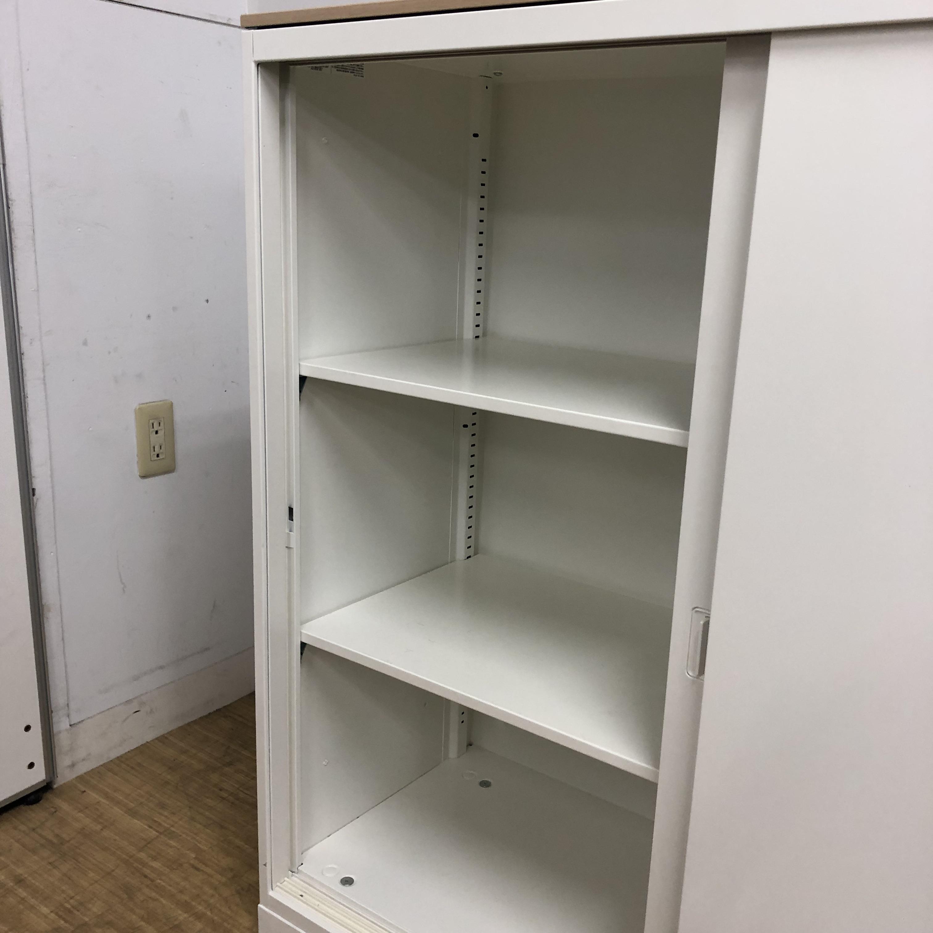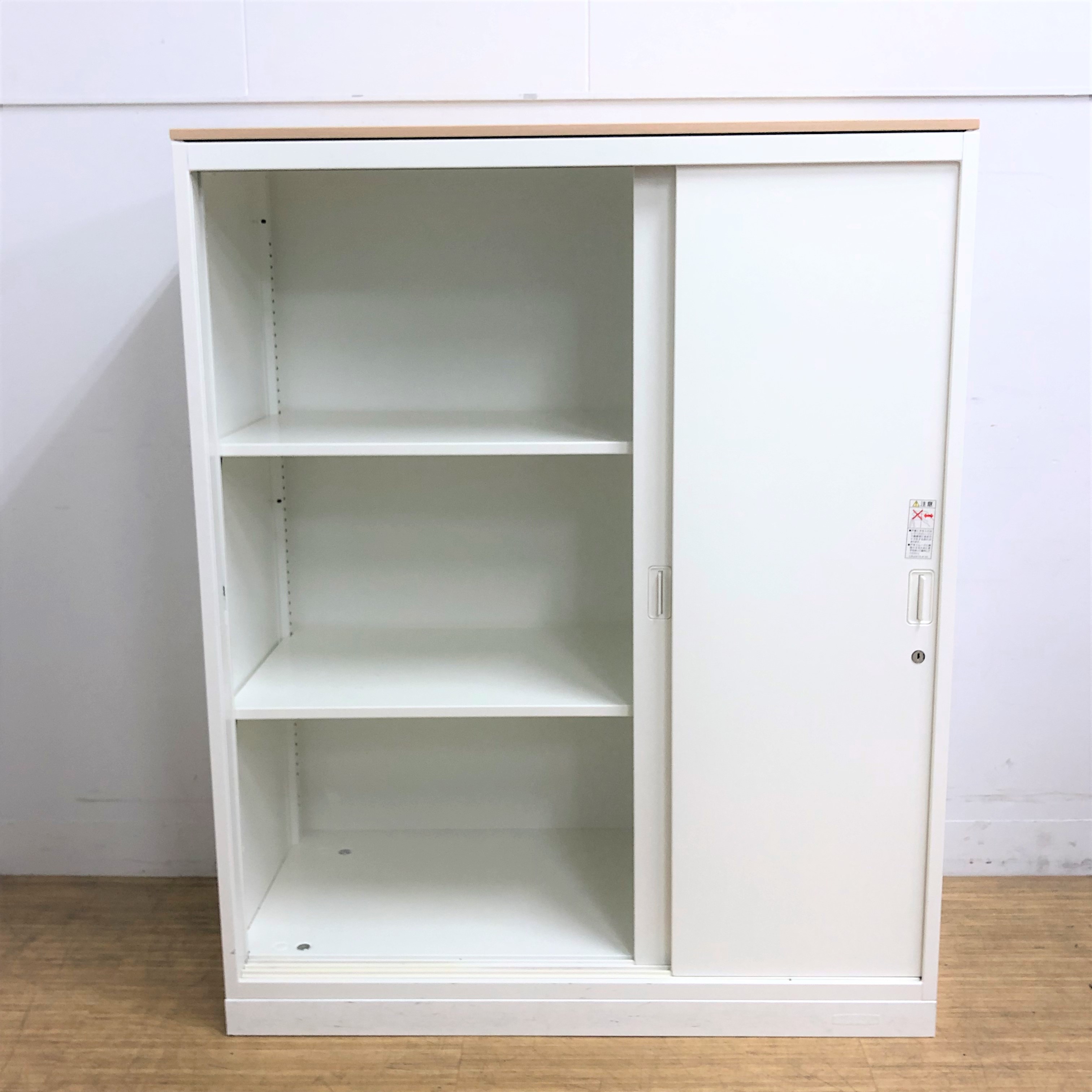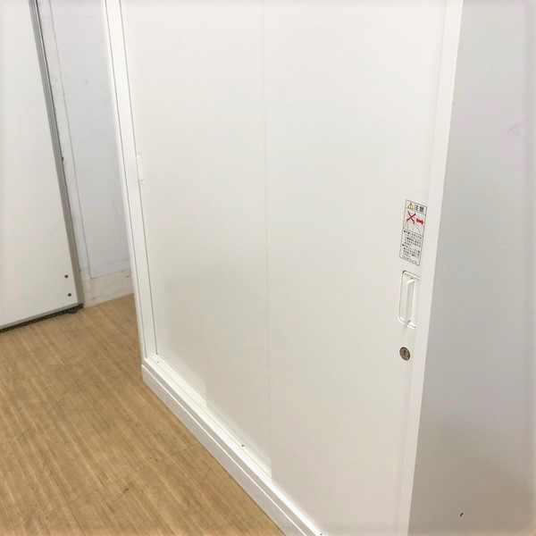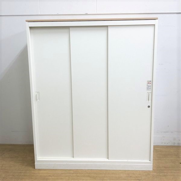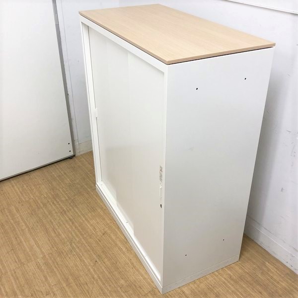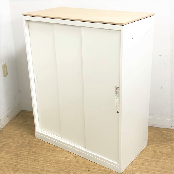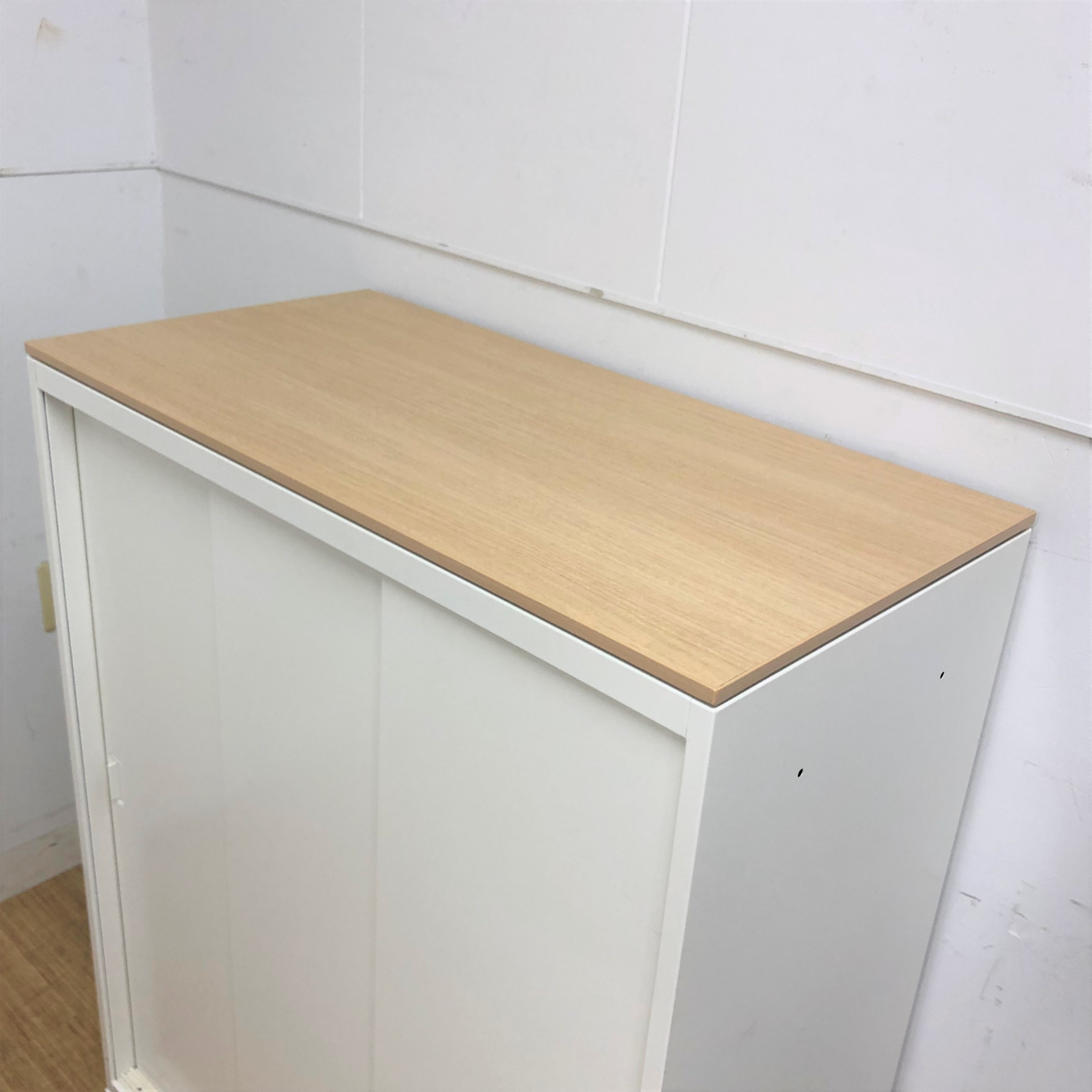 ナチュラル天板付き ホワイトキャビネット 使いやすい3枚引き戸 オカムラ レクトライン 鍵付き- 名古屋千種店