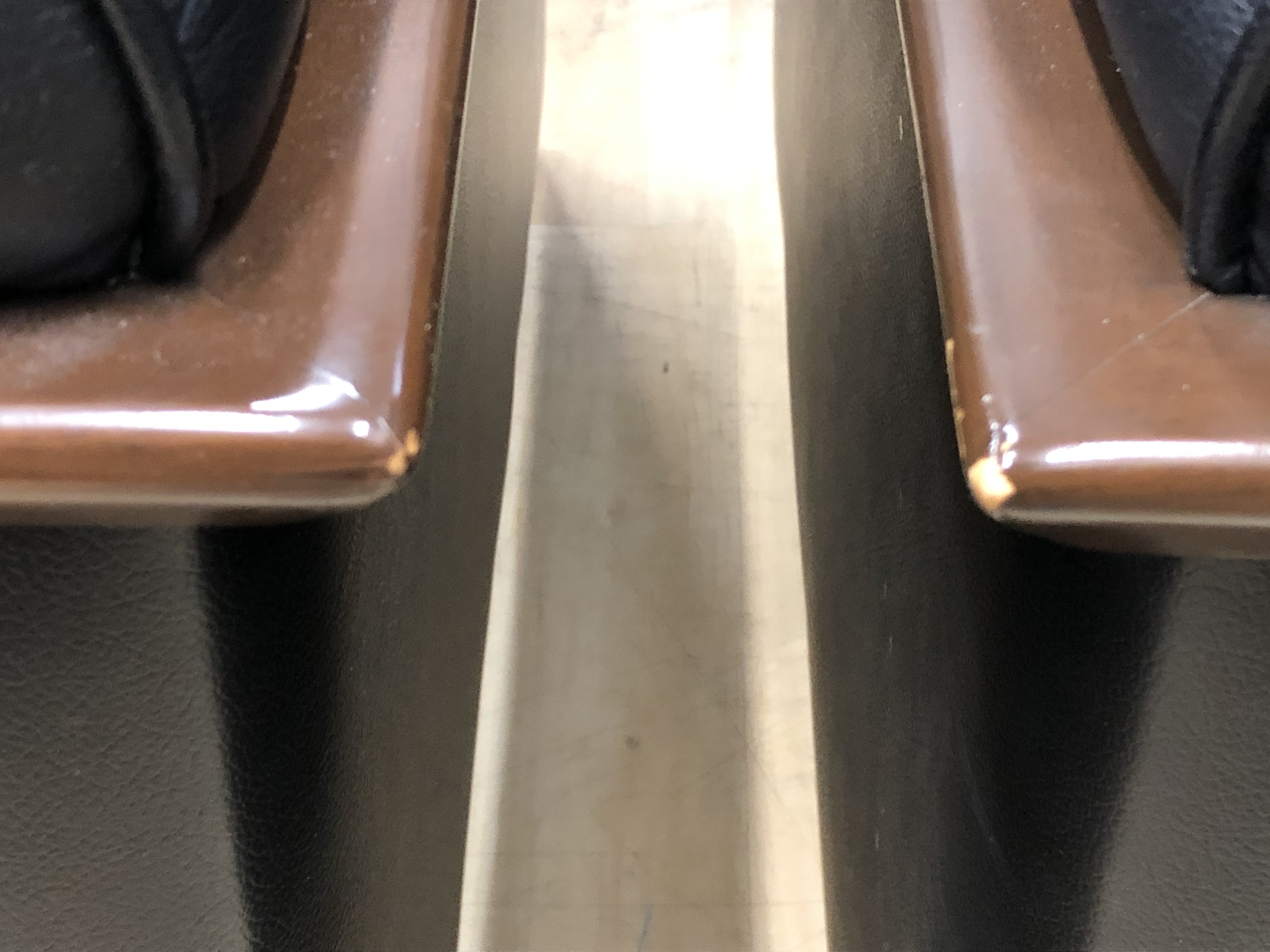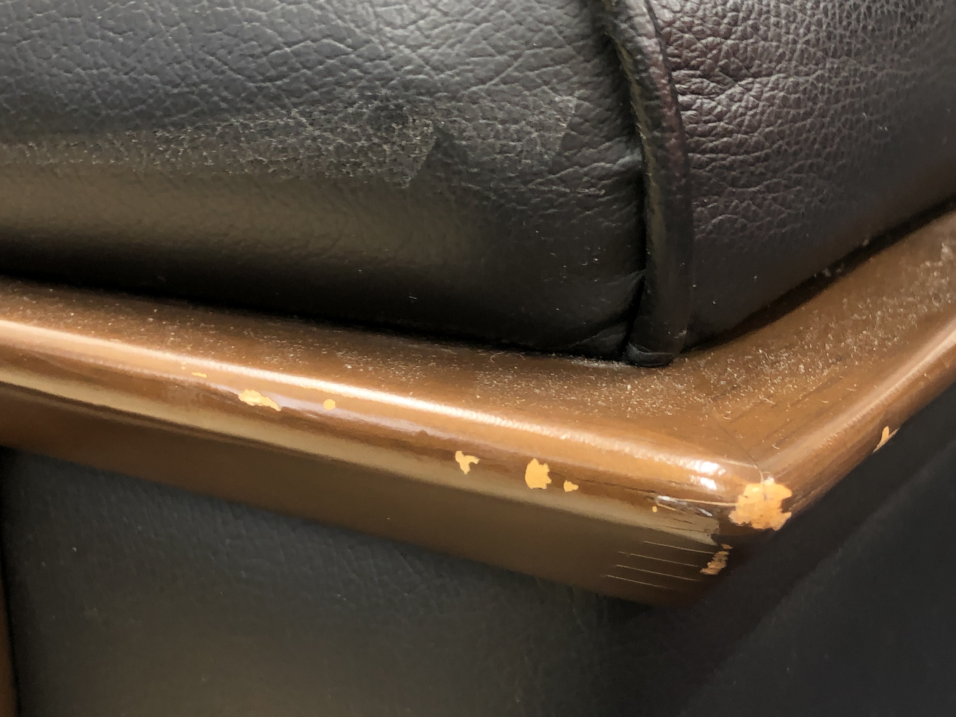 - あり黄ばみ・変色が広い範囲にうっすらある、または濃い黄ばみ・変色が一部ある。(例:三人用ソファ、二人用ソファ、一人用ソファの場合、背もたれ、肘かけ、座面等、 センターテーブルの場合、天板、脚にある。)