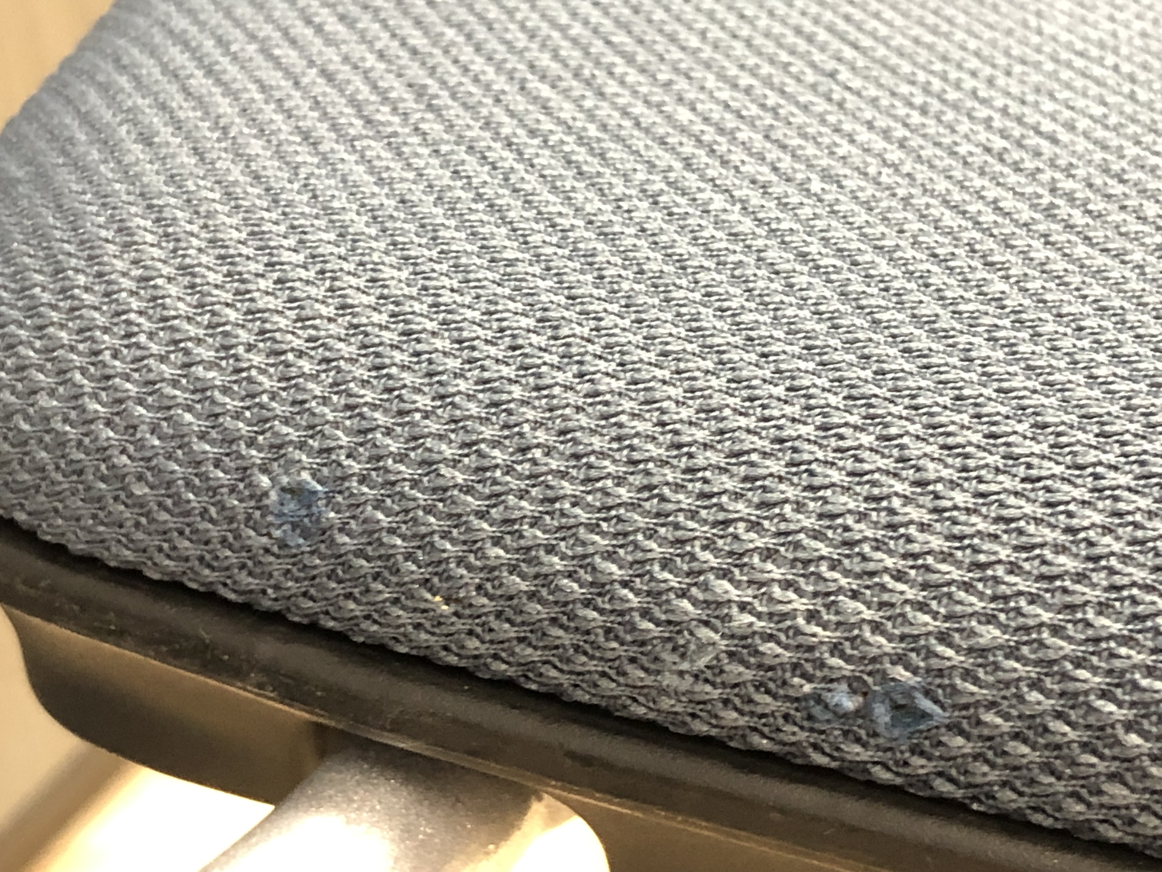 - あり黄ばみ・変色が広い範囲にうっすらある、または濃い黄ばみ・変色が一部ある。(例、座面・背もたれ、脚部等にある。)