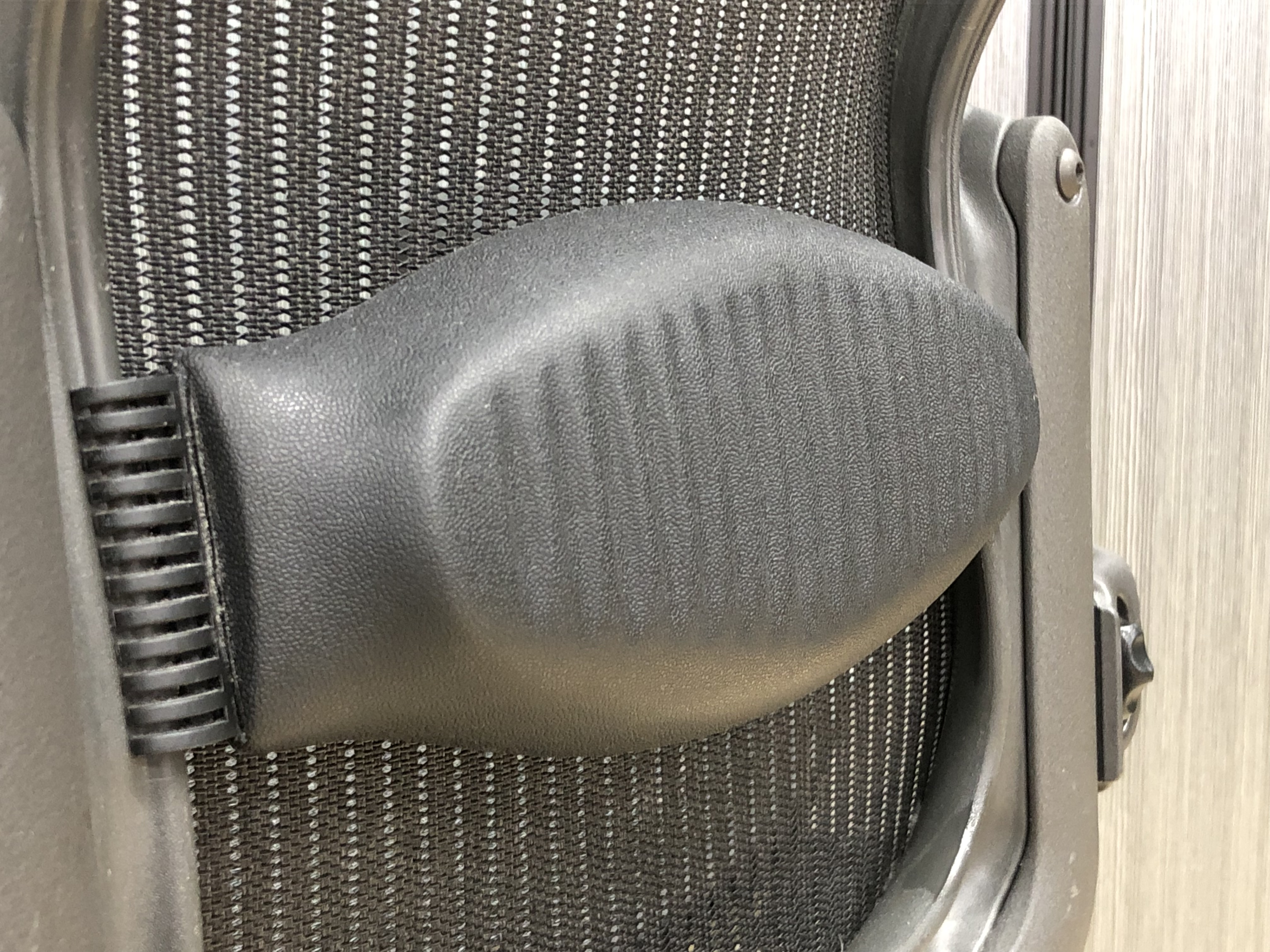 - 背もたれの裏にあるランバーサポート(パッド) の厚さは裏表で調節。上下の移動で、適切な高さ に調節できます。